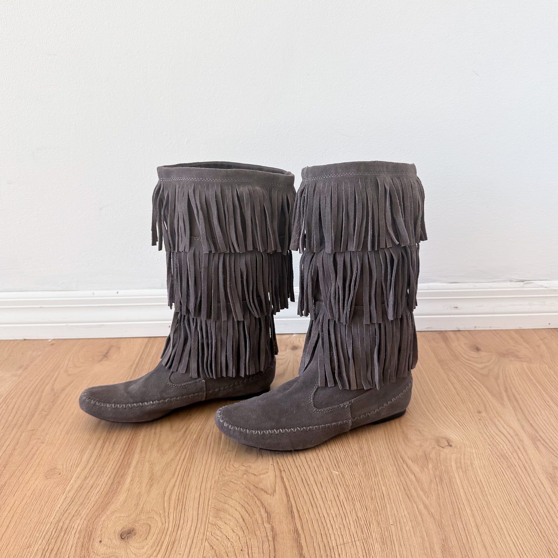 2010's Grey Fringe Moccasin Boots / SZ 8
