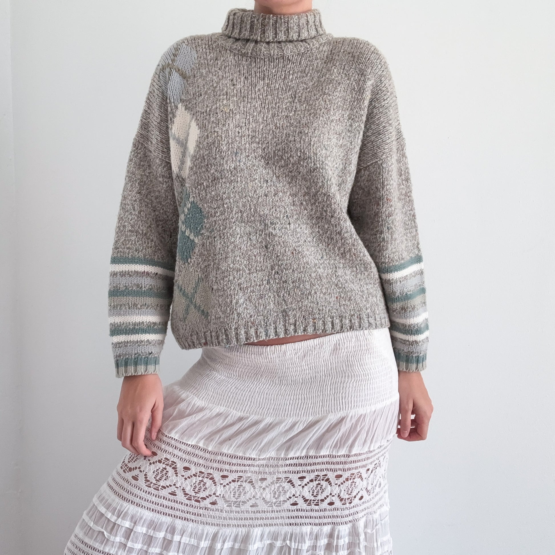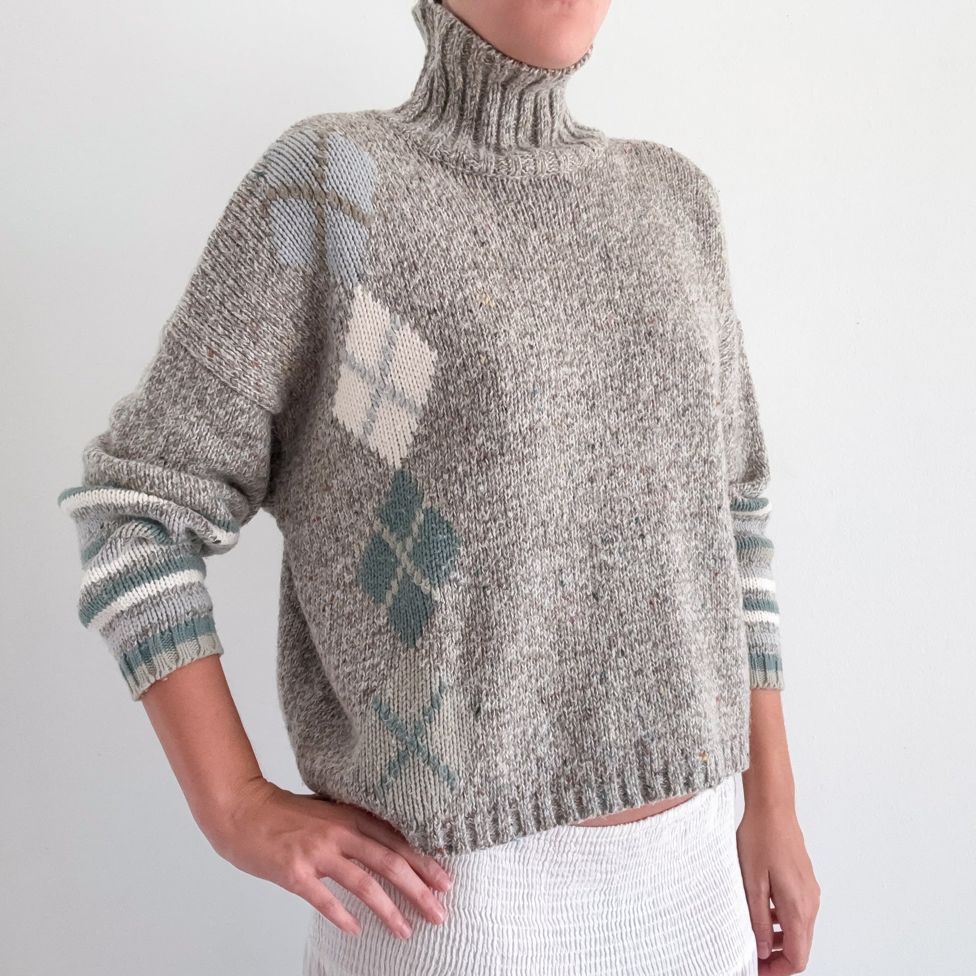 feels like acrylic blend--heavy weight sweater knit--turtleneck--argyle print detail--drop shoulder