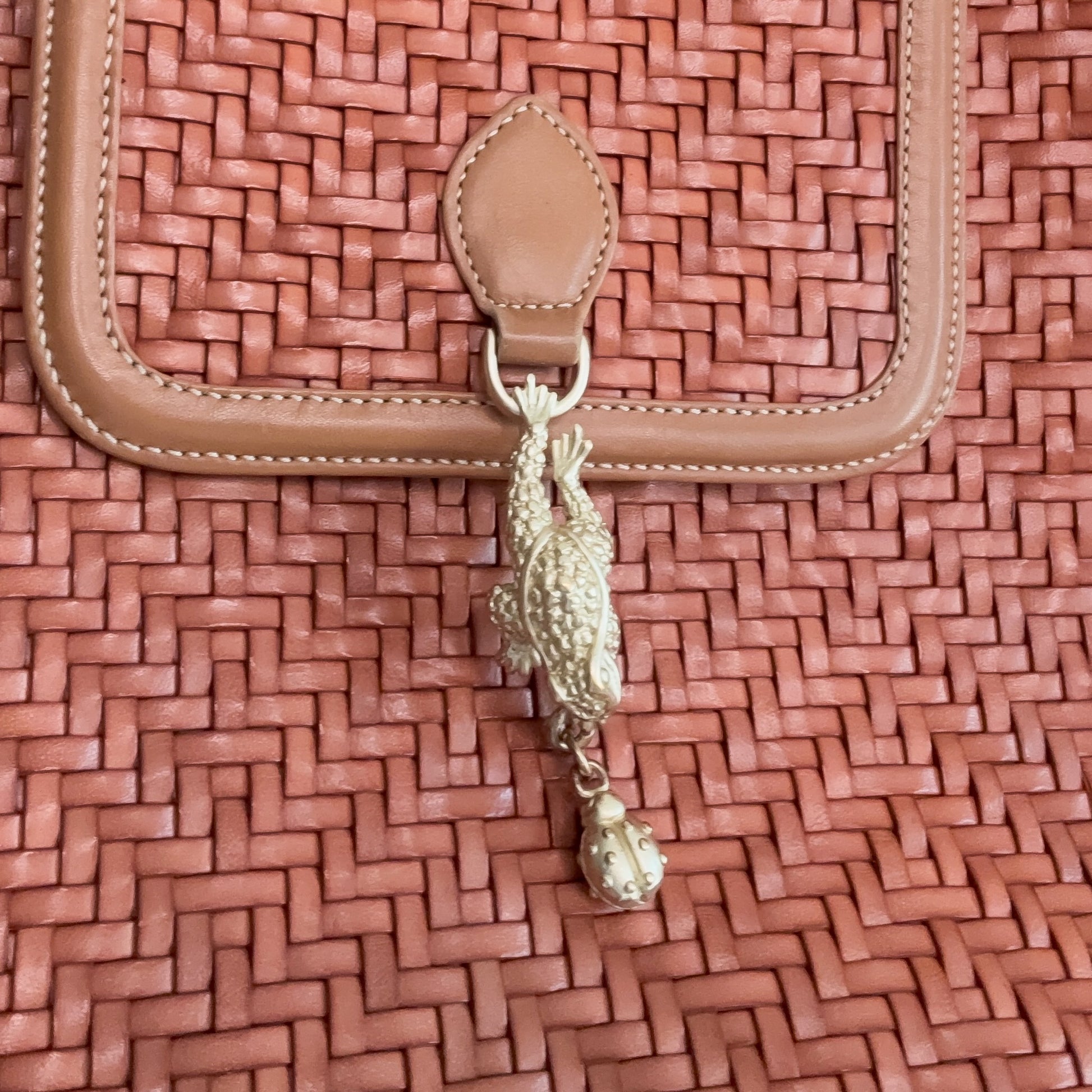 woven leather--by 90's designer: Barry Kieselstein-Cord--handmade in Italy--dark green suede lining--gold chain and leather straps--flap-over with magnetic snap button closure--gold frog and ladybug charm detail--moon and star charm on inside zipper compartment--in great condition--comes with dust bag