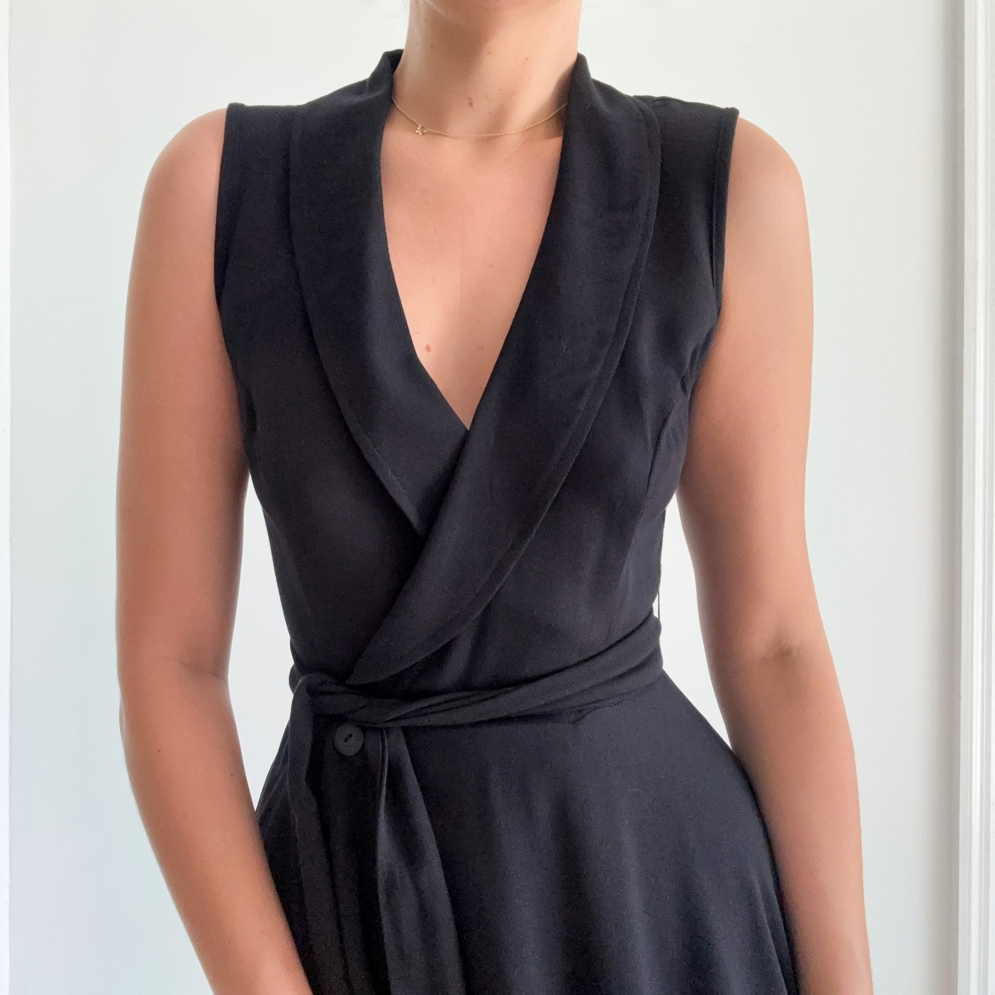 rayon acetate blend--90's Frederick's of Hollywood--made in USA--wrap style with inside and outside button closure--long thick waist tie that can be tied in front or back--flared skirt--button closure at neckline