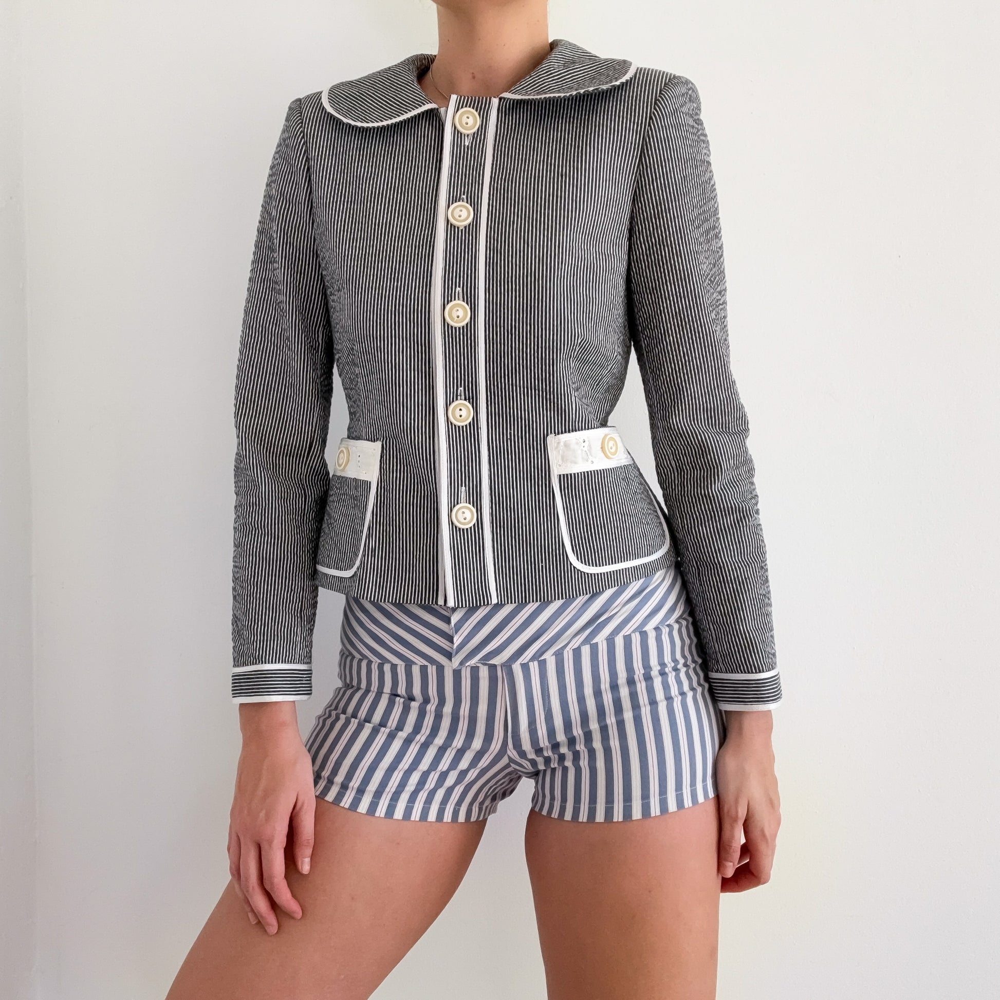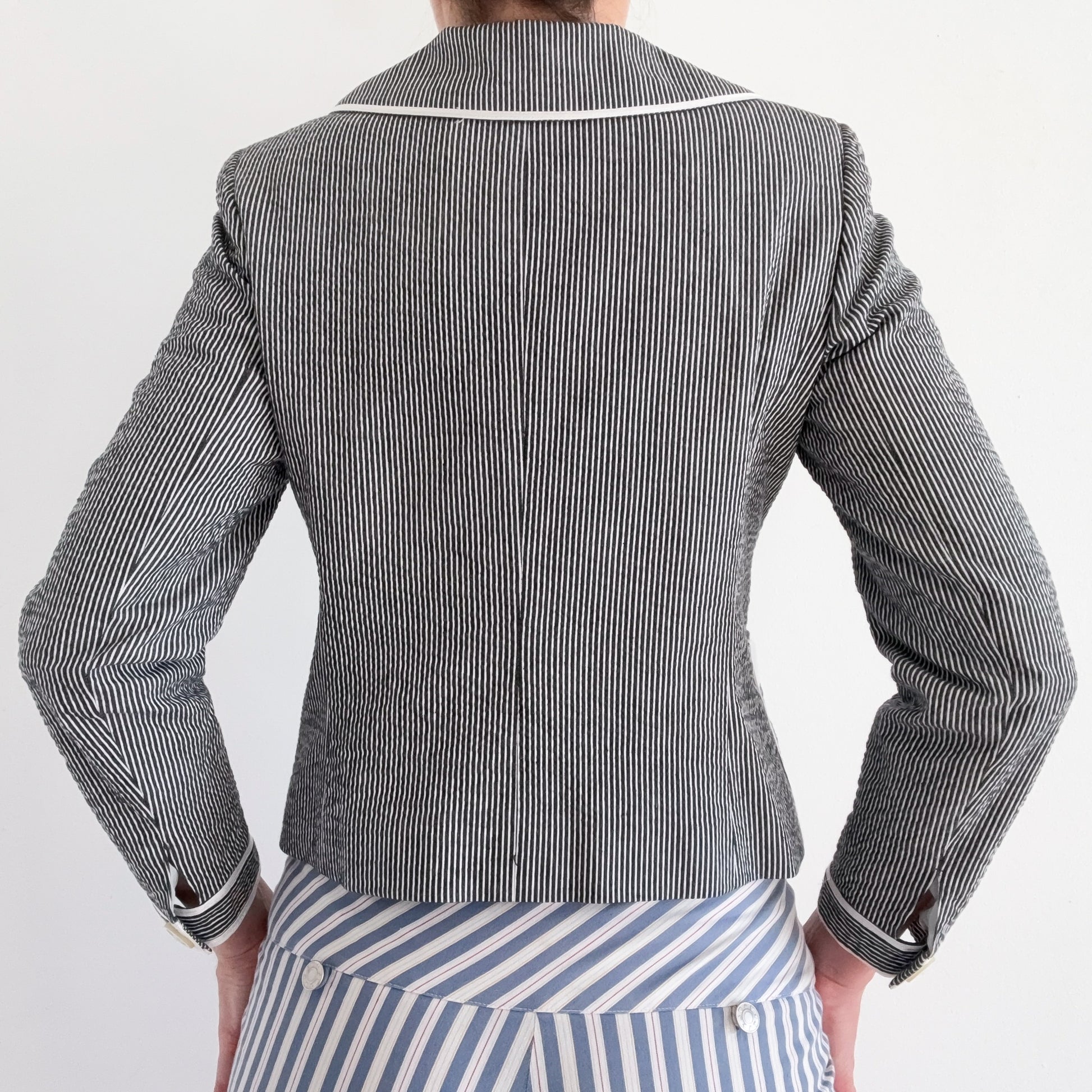 cotton spandex--seersucker fabric--lined--90's Harve Benard Collection--eyelet trim detail on front pockets--built in shoulder pads--front button closure