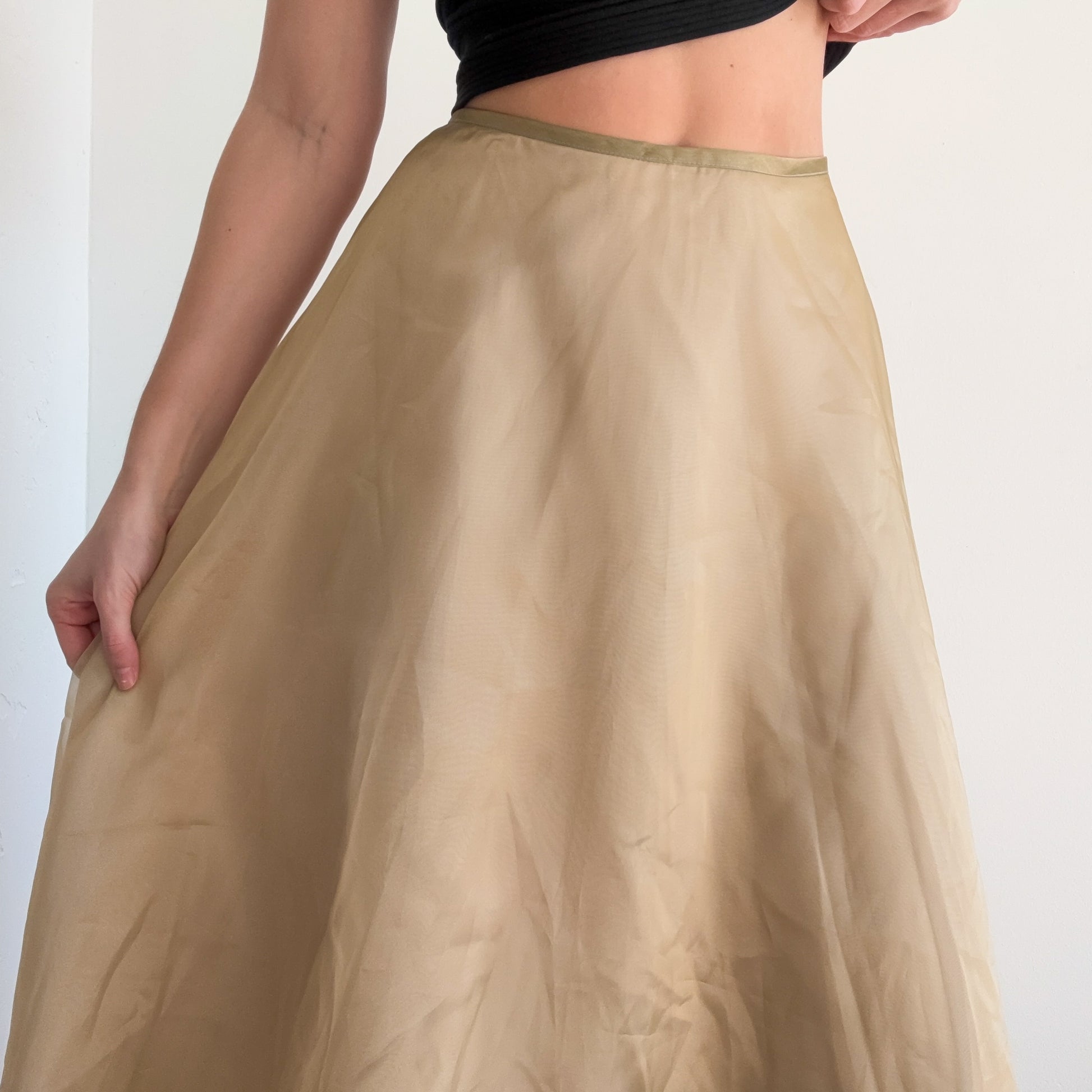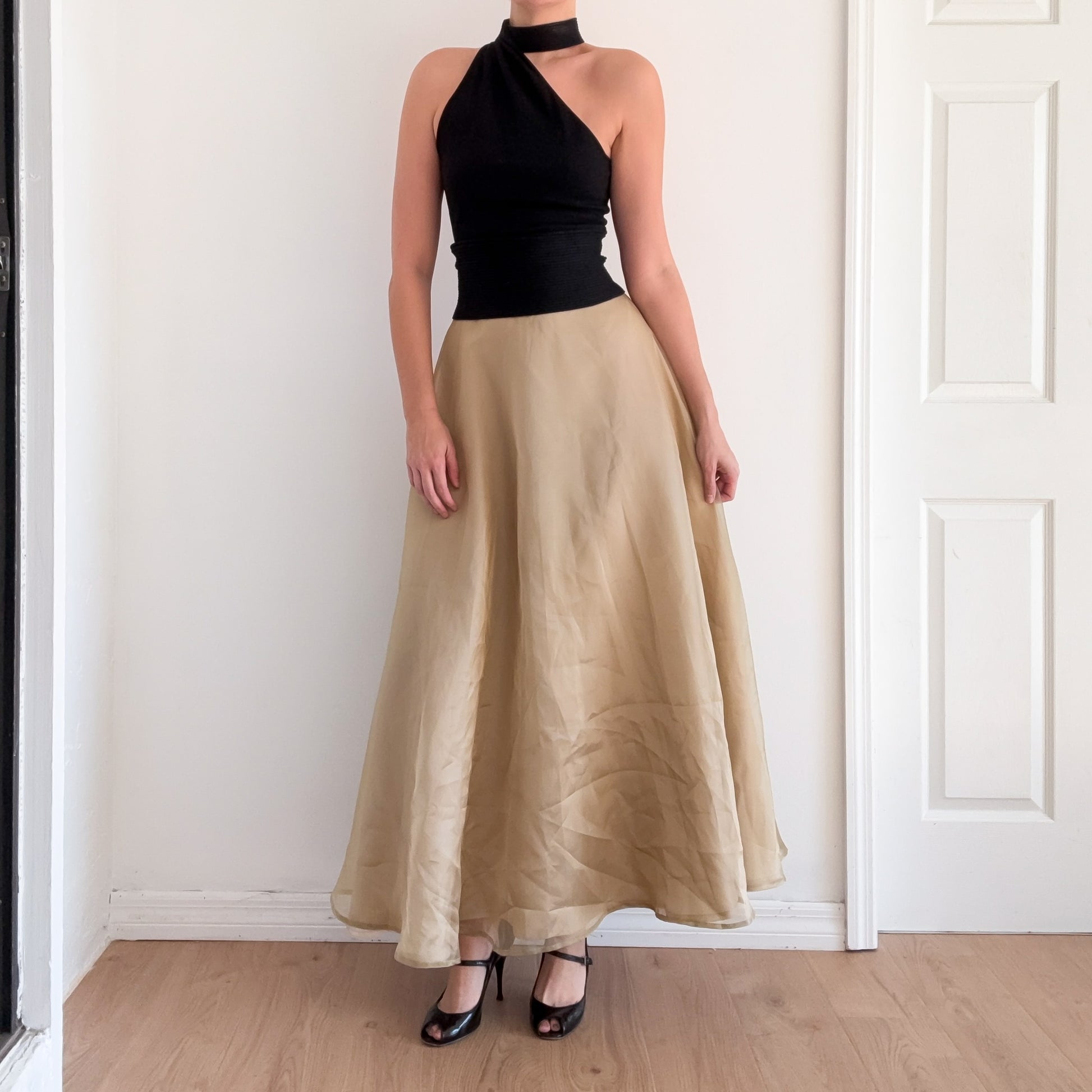 feels like polyester--organza-like material--lined--back zipper and hook closure