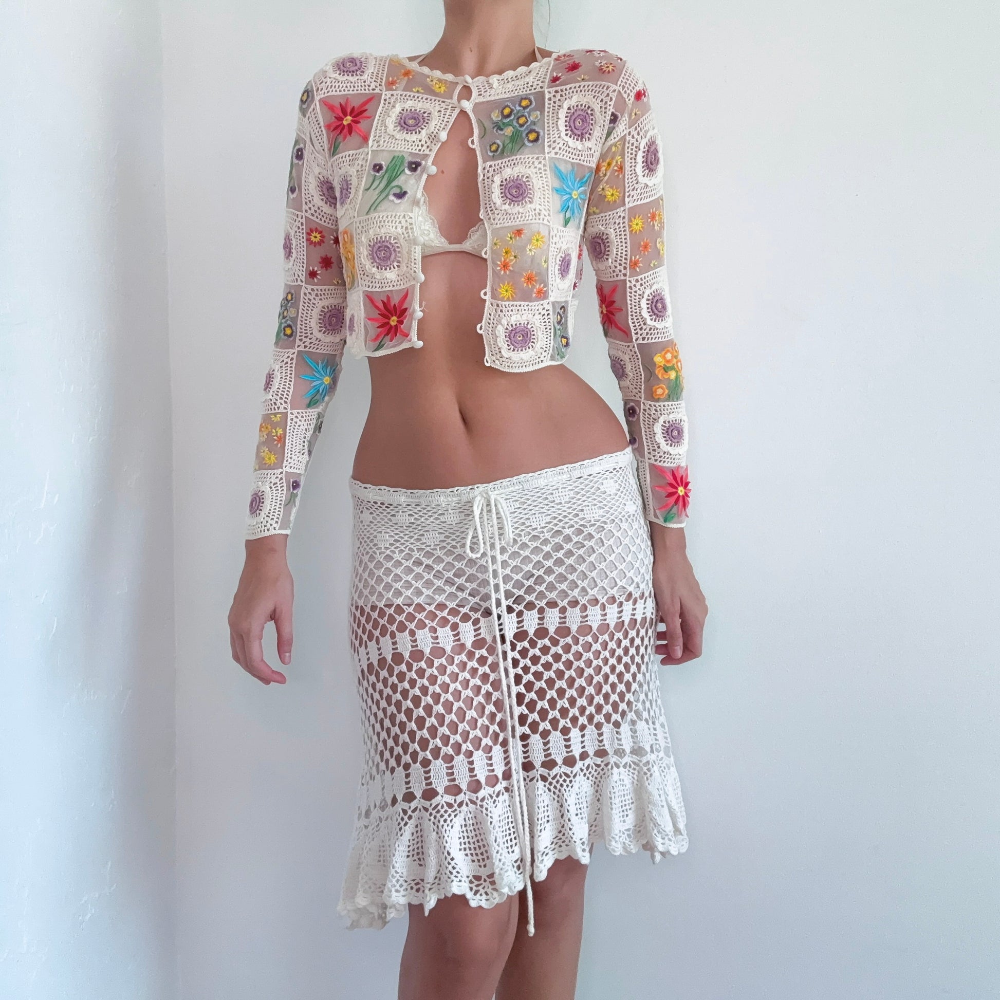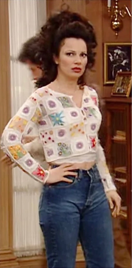 100% cotton--90's Moschino Cheap & Chic--worn by Fran in the Nanny! (pictured)--front button closure--crochet with embroidered flowers on mesh
