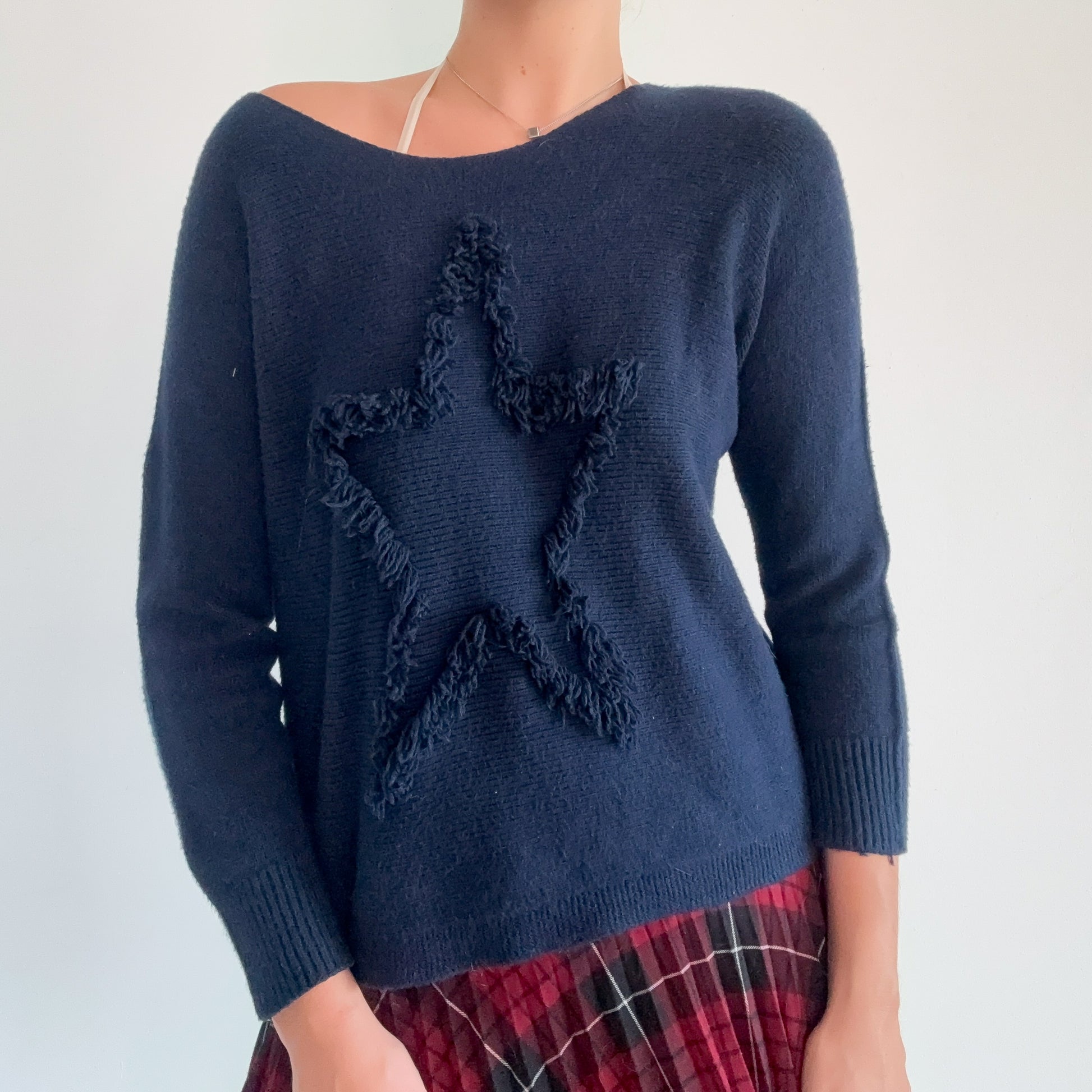 viscose pbt nylon blend--medium weight knit--**not vintage, from a store in Design District in Miami--fringe texture in the shape of a star--can be worn off the shoulder--has some pilling
