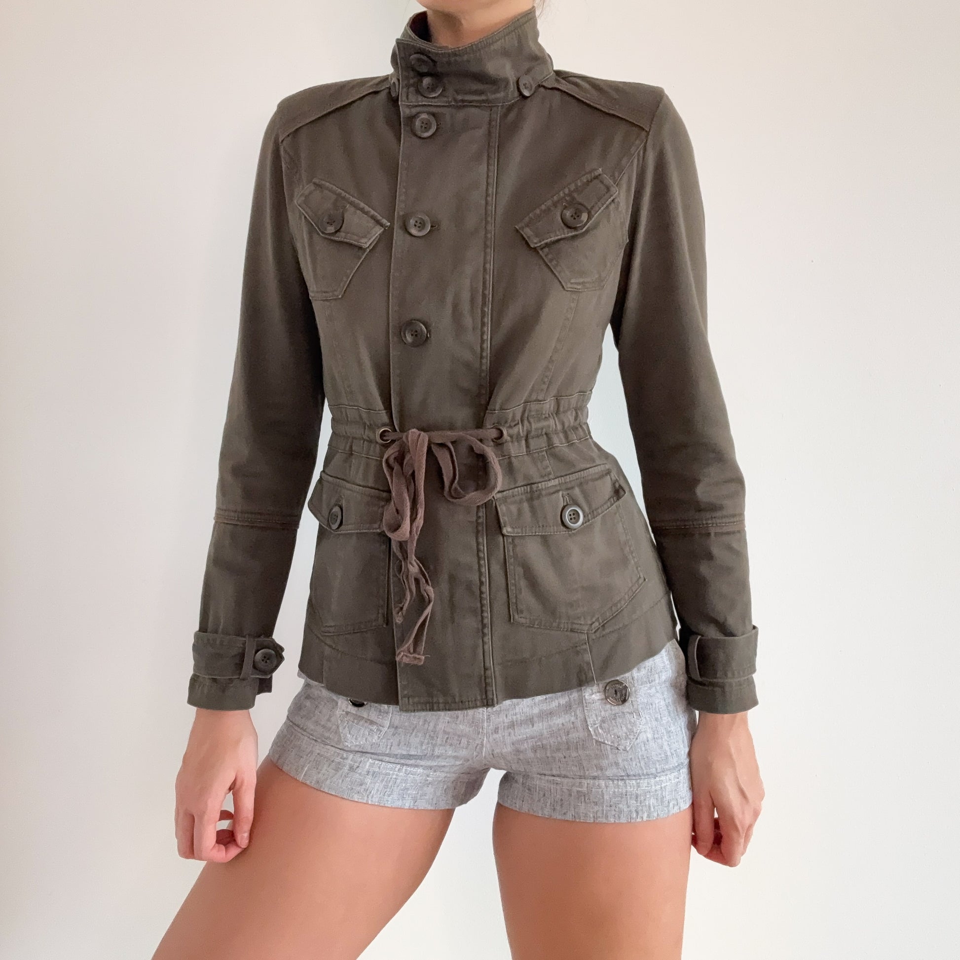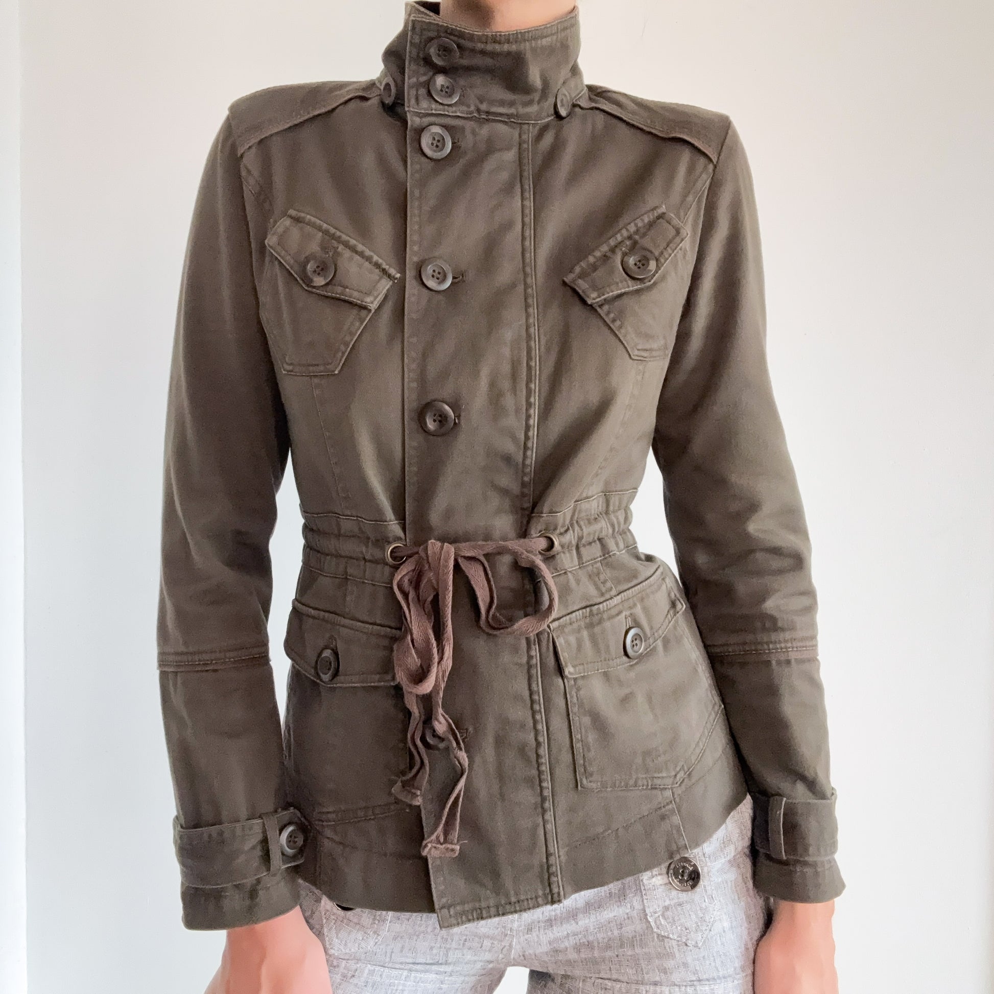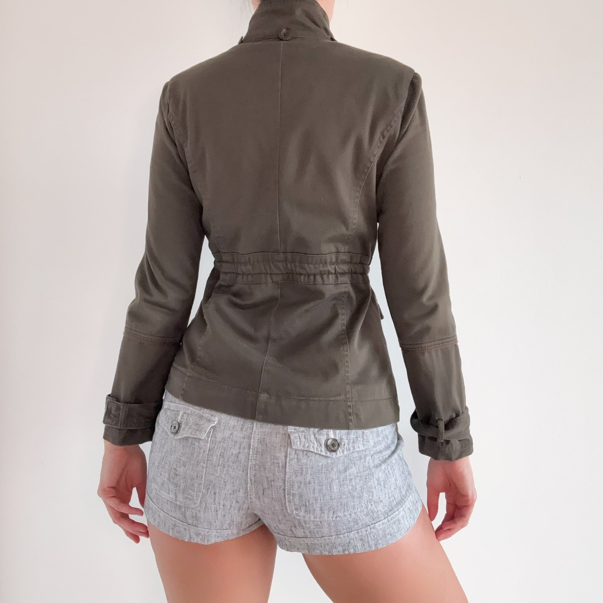 95% cotton, 5% spandex--brown pinstripe lining--Y2K Forever 21--front zipper closure with flapper button closure--high mock neck with button closure--adjustable drawstring detail at waist--front pockets