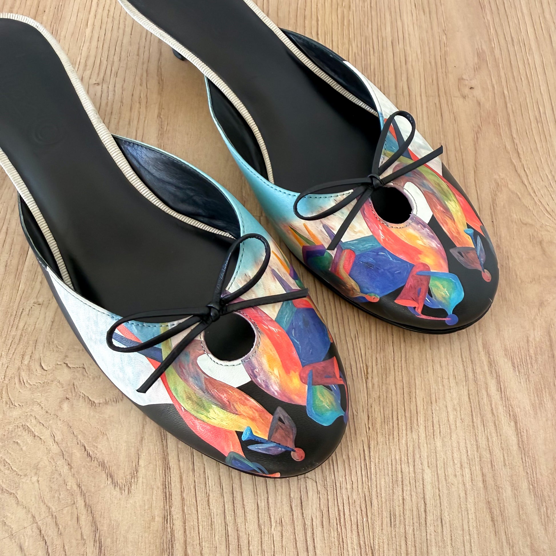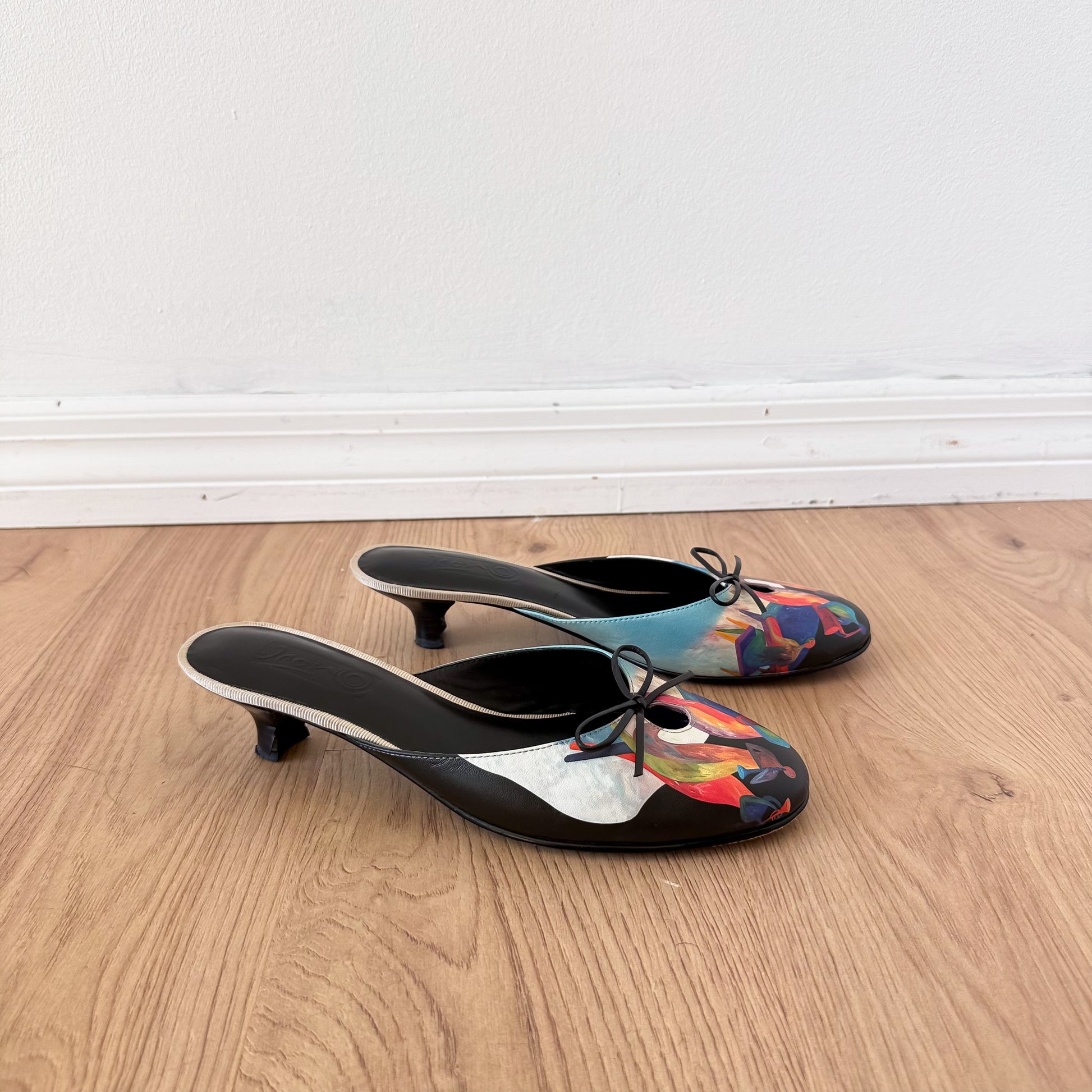 feels like leather --vero cucio--Y2K "Jeon"--artwork of people playing instruments--round toe--bow detail--kitten heel--in great condition