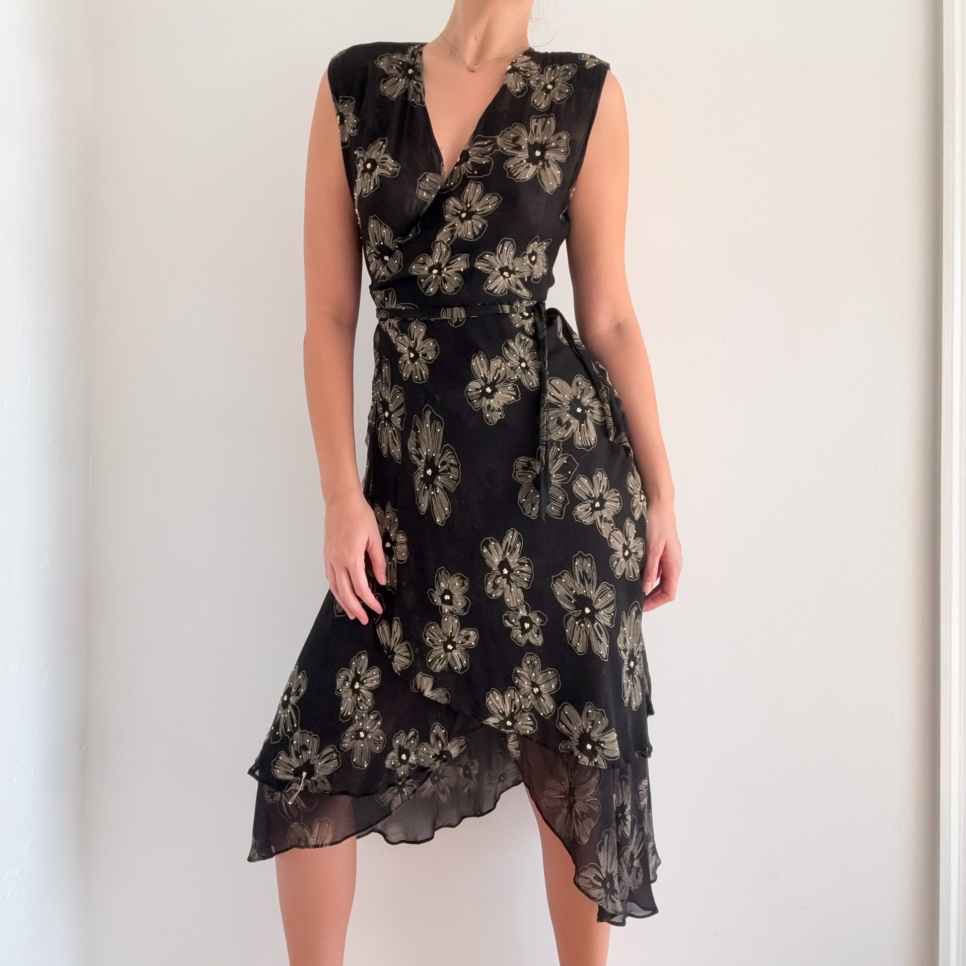 Y2K Black Floral Silk Wrap Midi Dress / SZ M/L