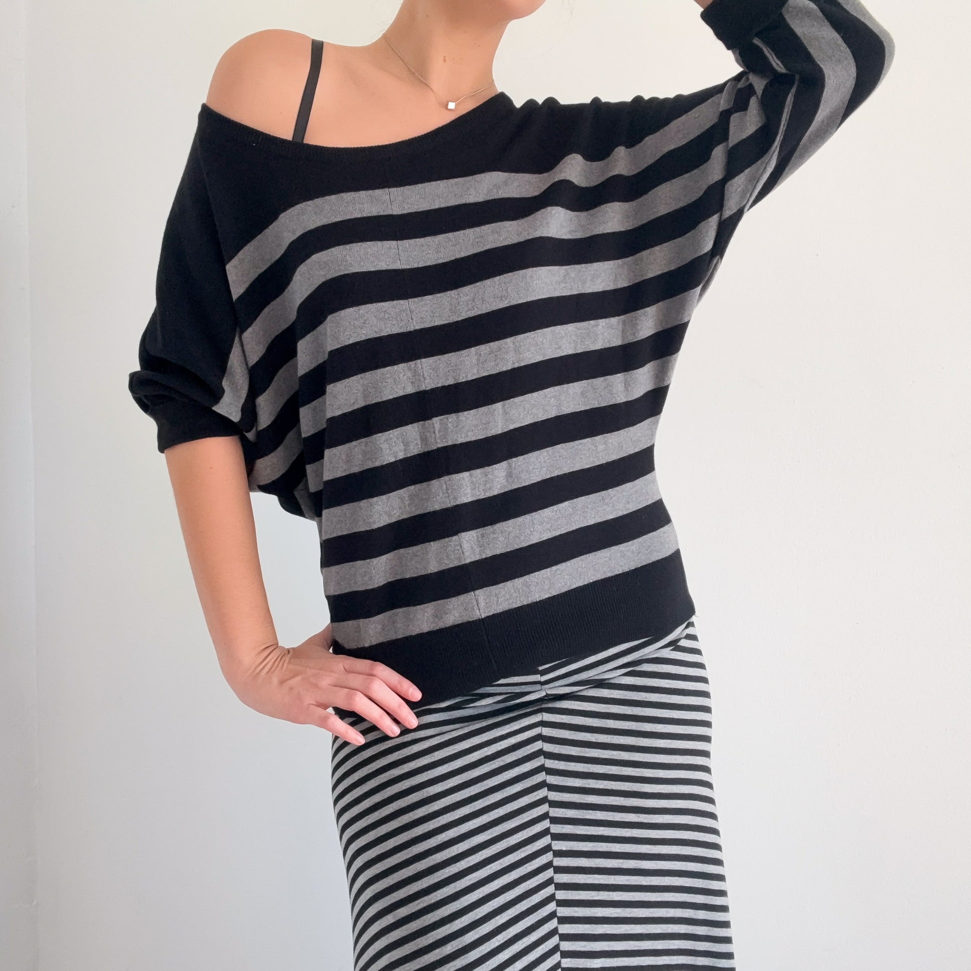 Y2K Black & Grey Striped Knit Dolman Sleeve Top / SZ S