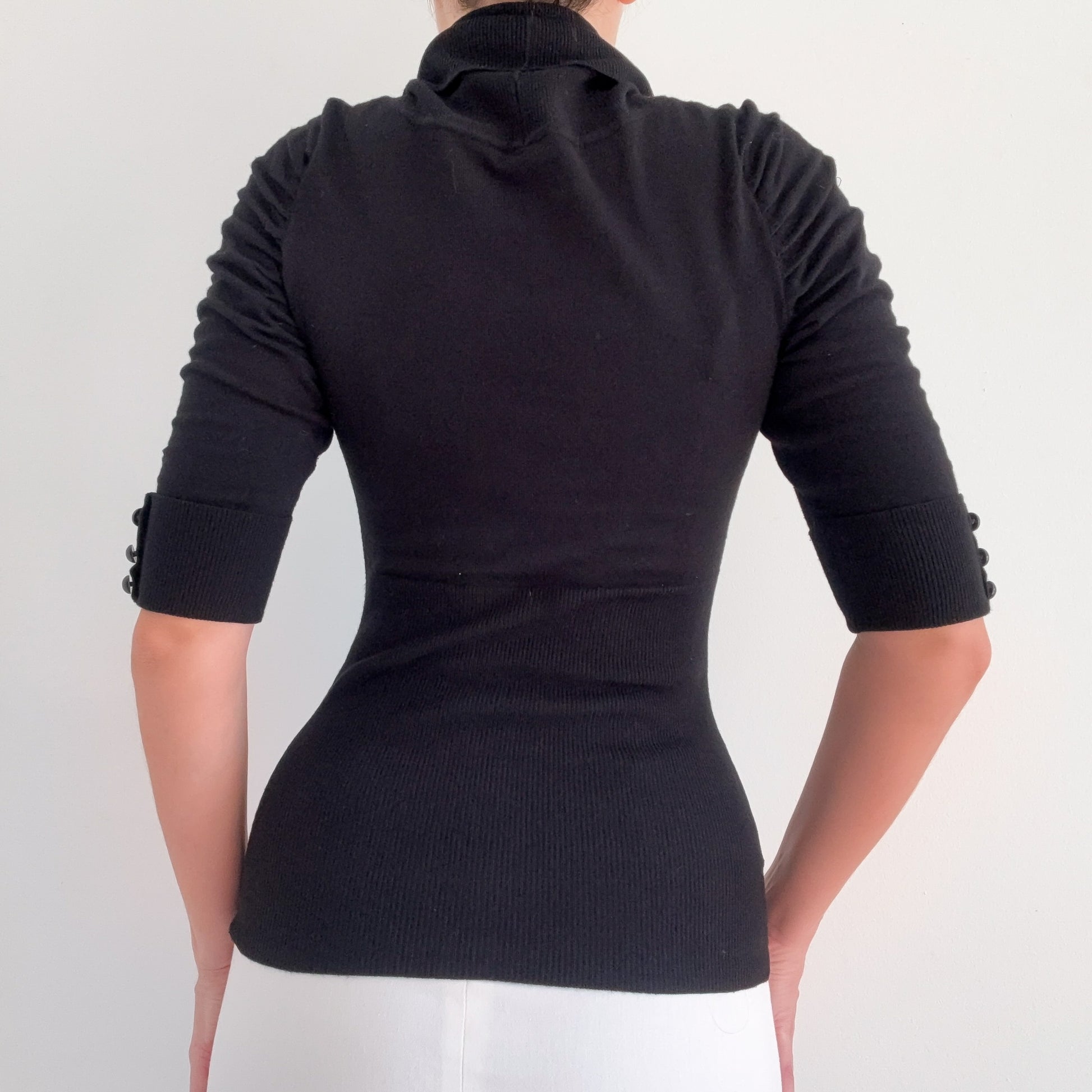rayon poly blend--knit--Y2K Derek Heart--cowl neck--ruffed cuffed sleeves with button detail--fitted ribbed waist