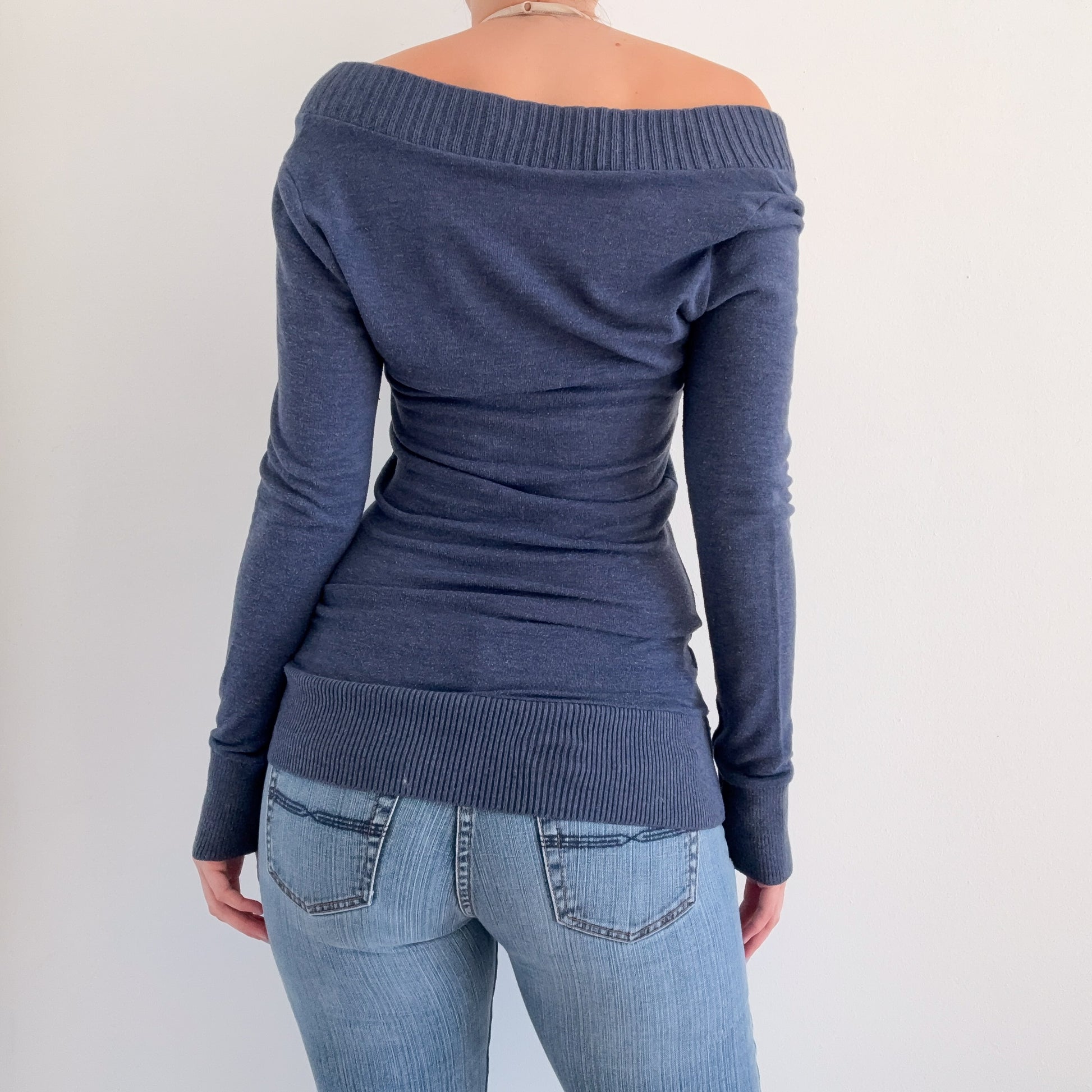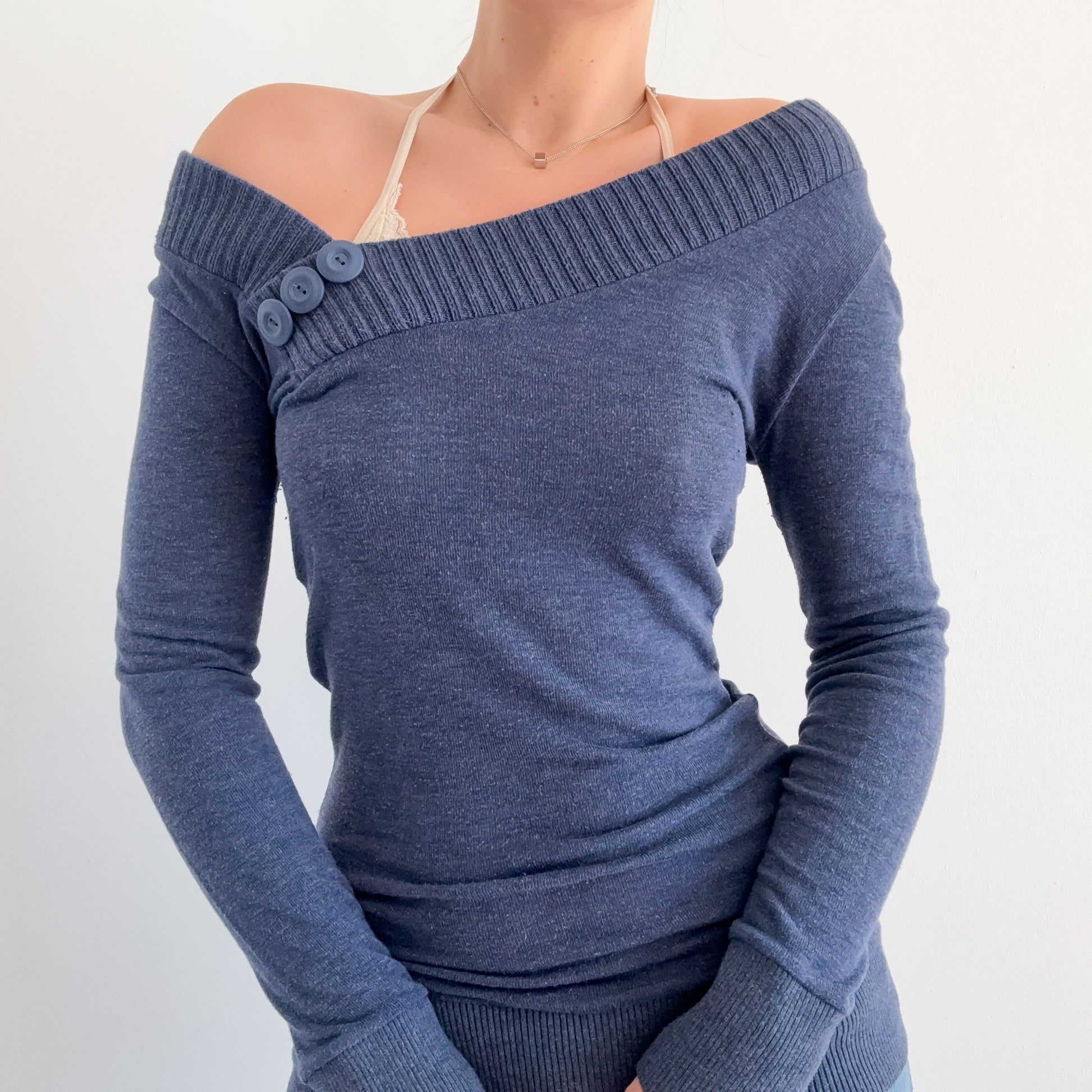 cotton rayon spandex blend--knitted--Y2K "Poof"--off the shoulder with three button detail--**has some minor pilling