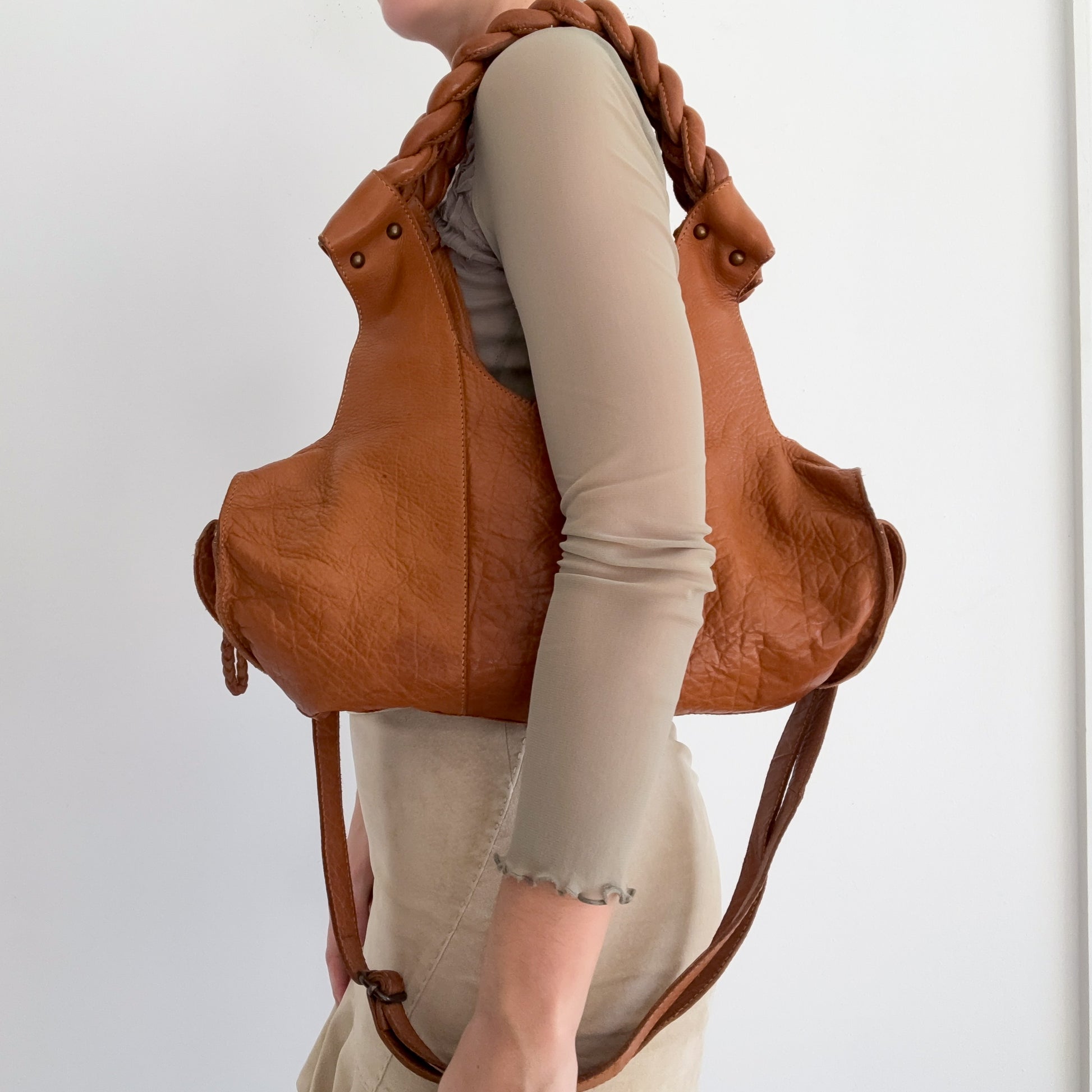 100% leather--buttery soft leather (super nice)--100% cotton lining--Y2K "Nest"--chunky braided straps--separate adjustable crossbody strap--zipper closure--inside compartments--side zipper and pocket compartments--has some wear: stain on back side and water stain on bottom, but overall in great condition