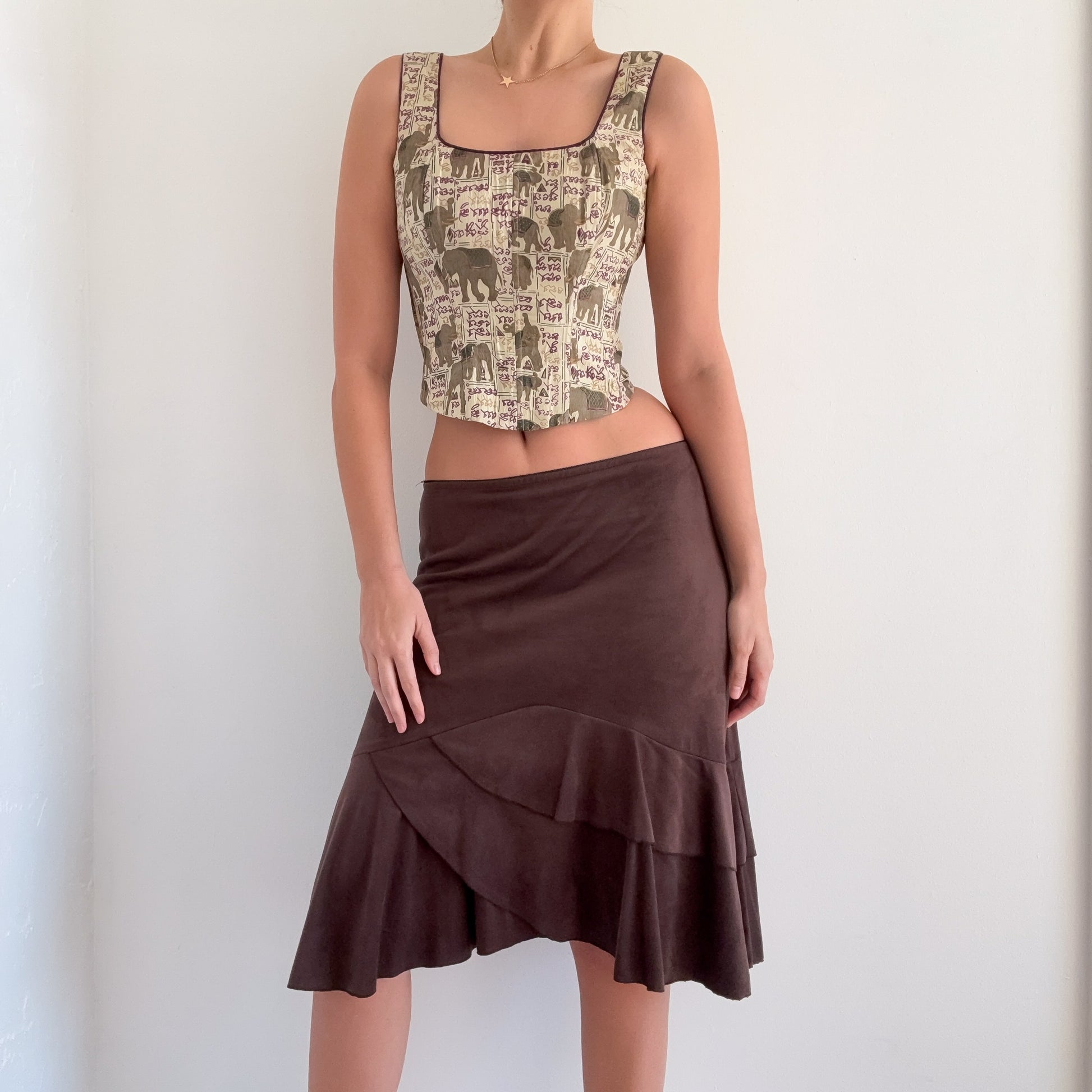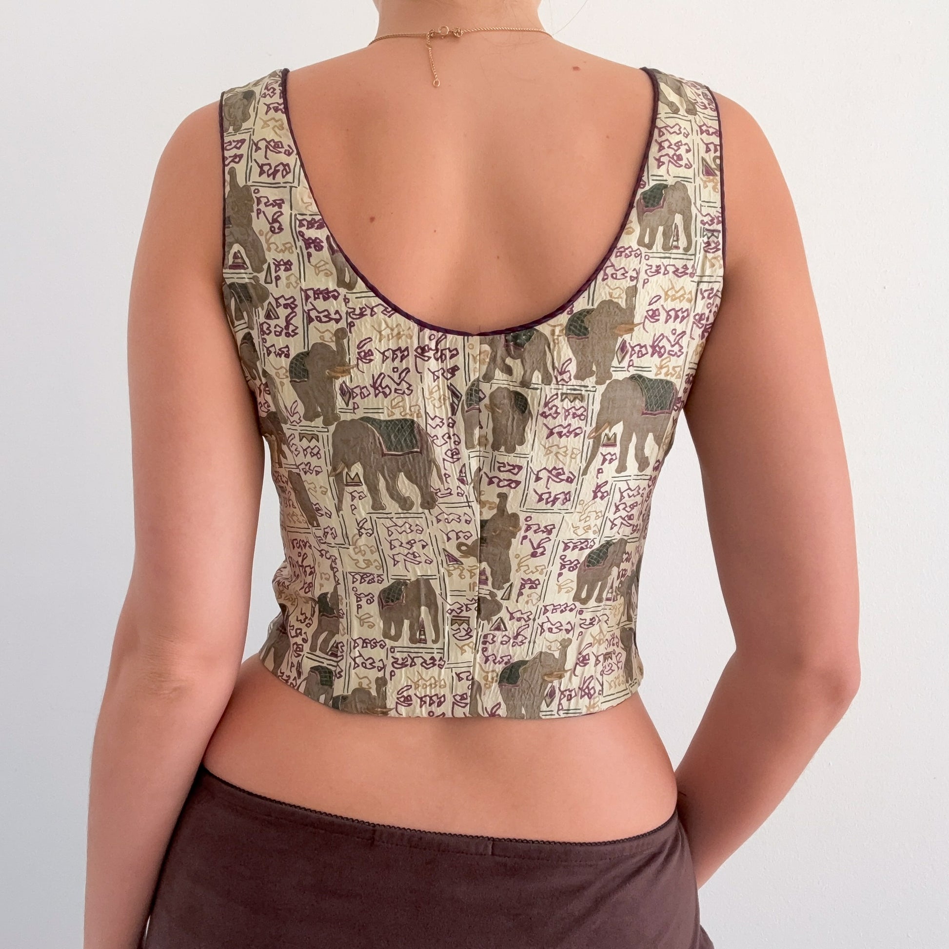 could be silk, but the fabric tag is missing--maroon lining--elephant print--side zipper closure--boning--Y2K "Nita Ideas"