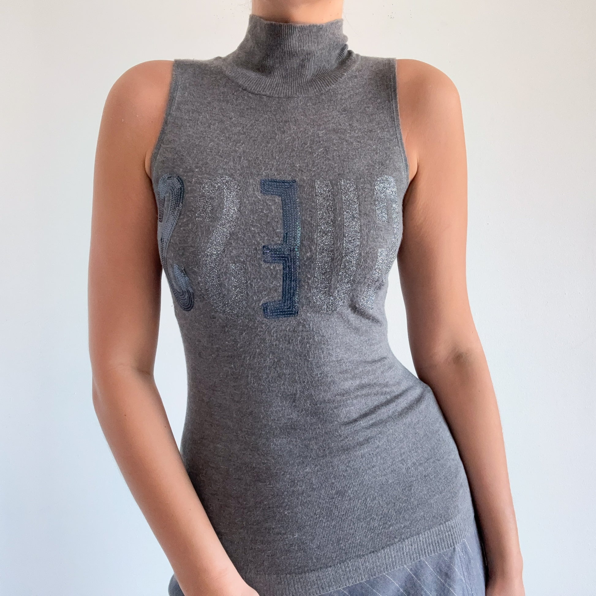 viscose poly elastane blend--knit--2010's Guess--logo in sparkle and blue sequins across the front--mock neck