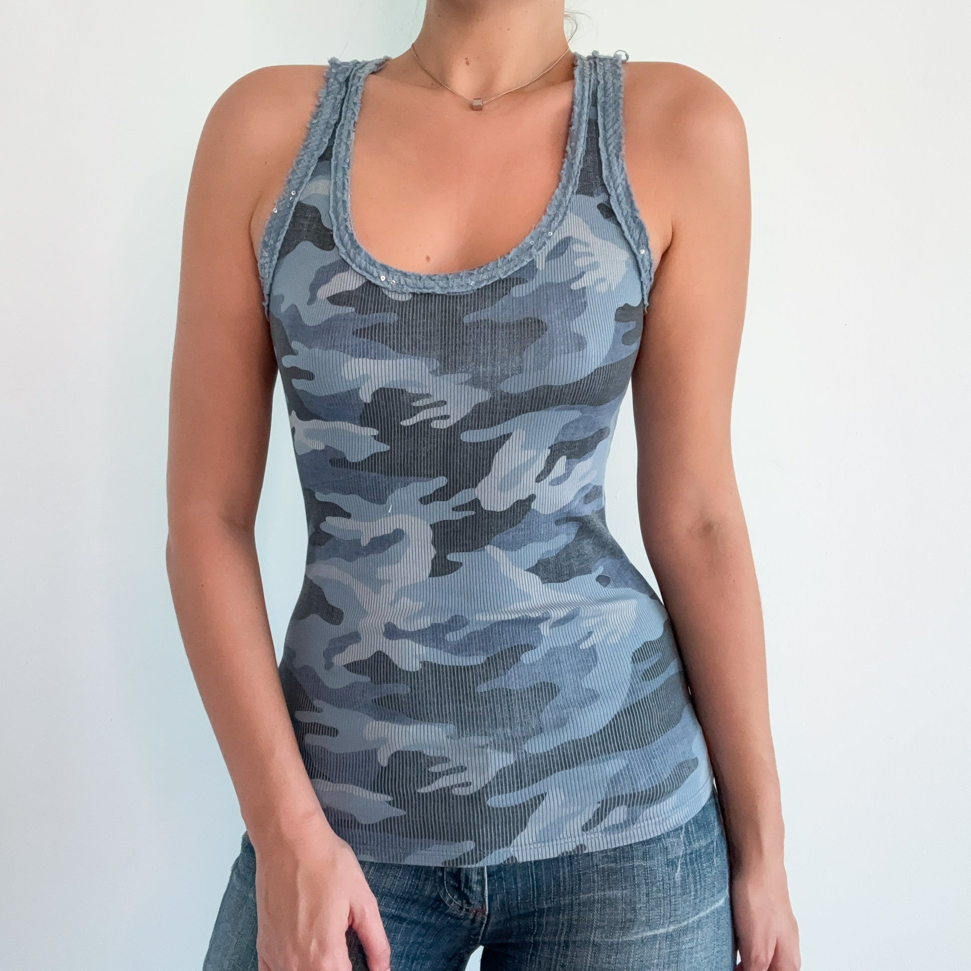 Y2K Italian Blue Camo Sequin Tank / SZ S