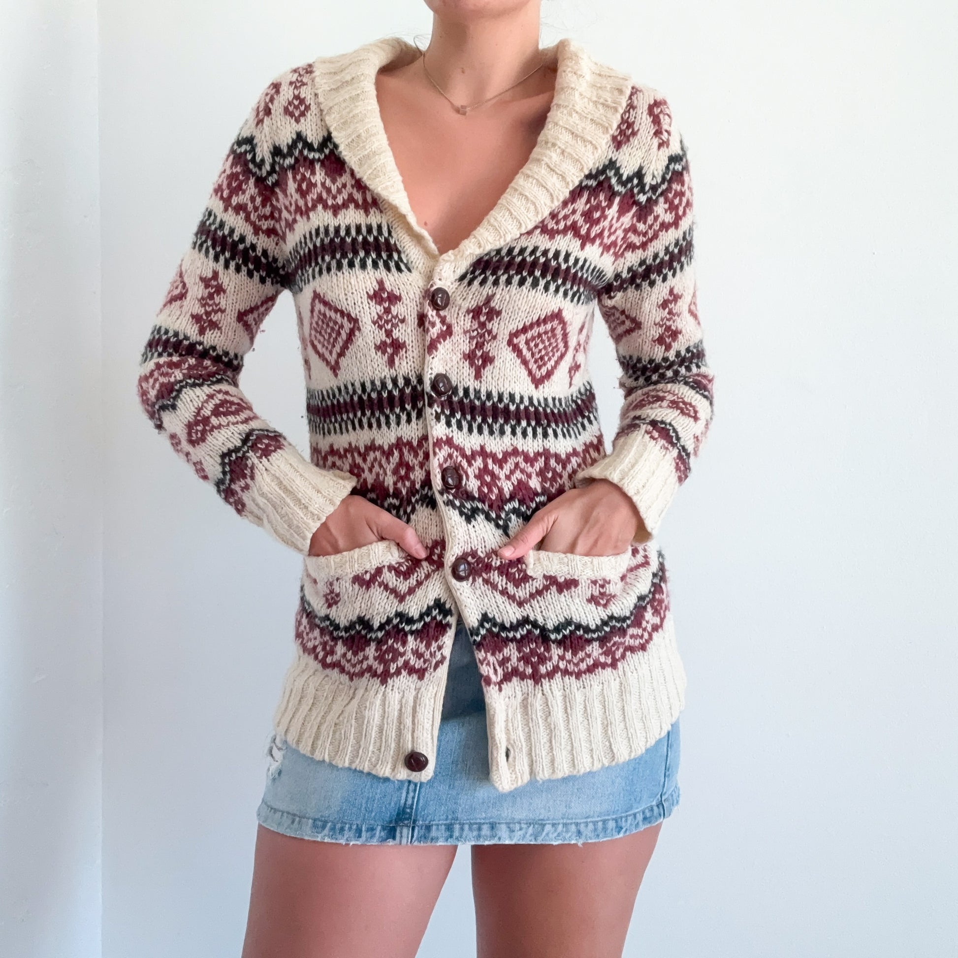 Y2K Ivory & Maroon Printed Knit Sweater Cardigan / SZ S