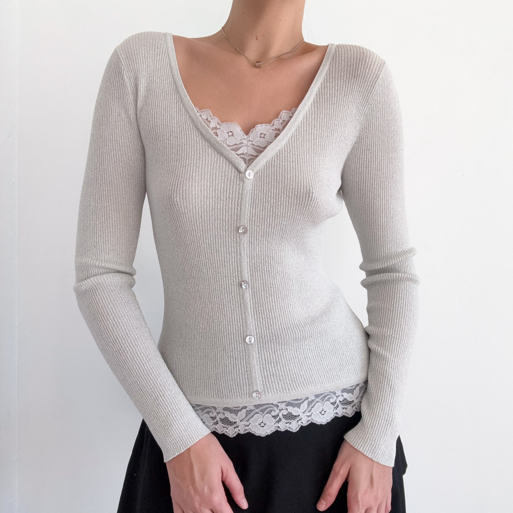 viscose silk poly metallic blend--sparkle knit--layered effect with lace trim--buttons are not functional
