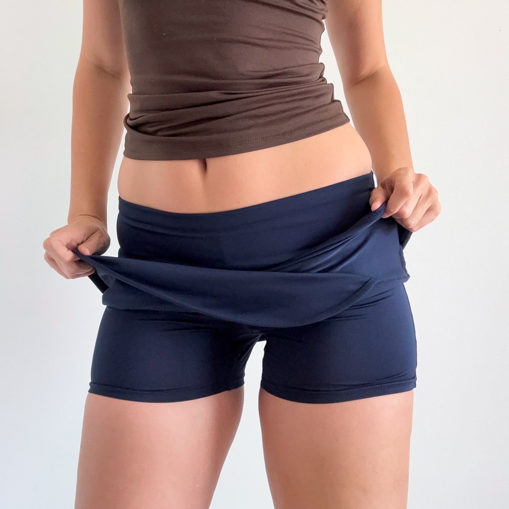 poly lycra--Y2K "Lucky in Love"--shorts attached underneath--layered detail
