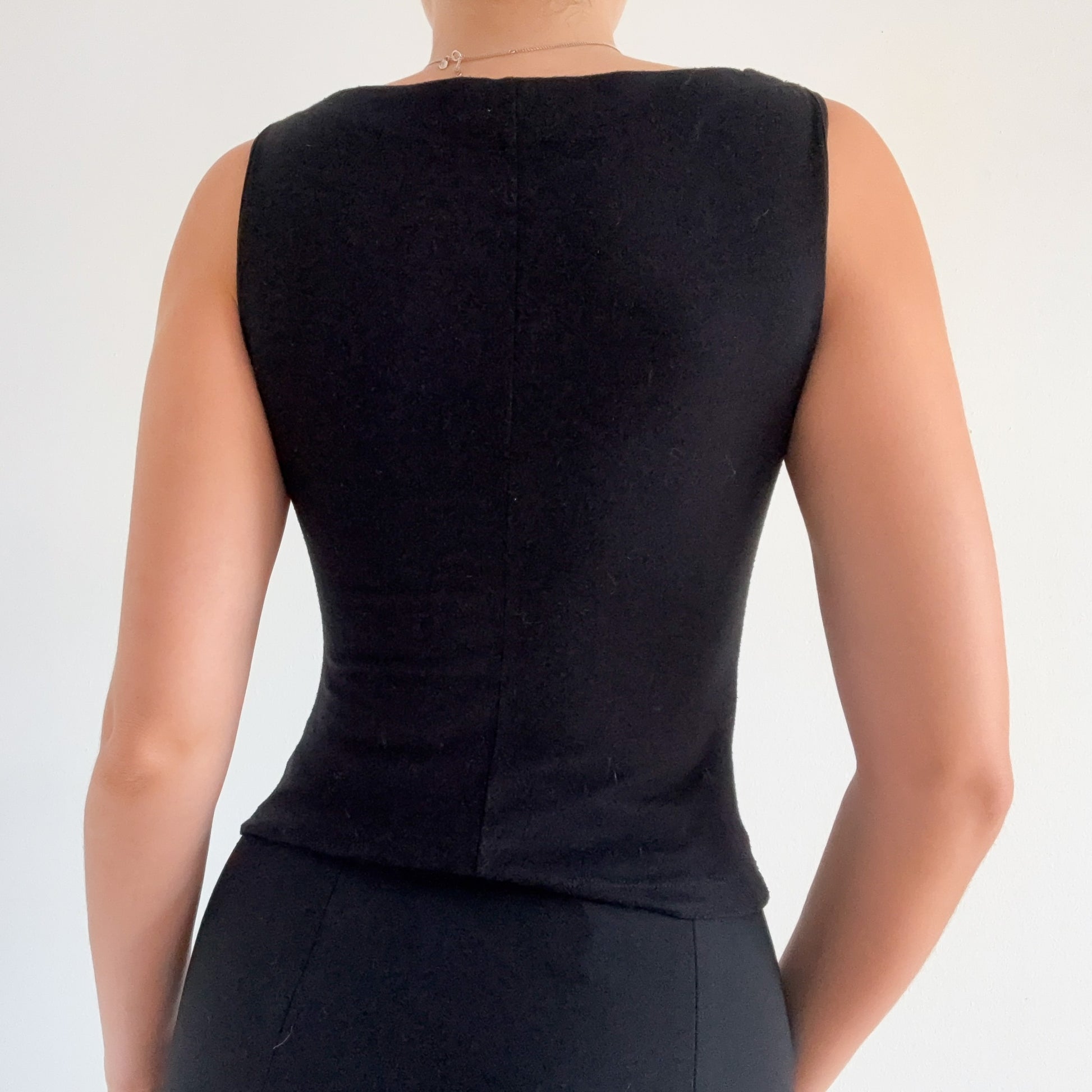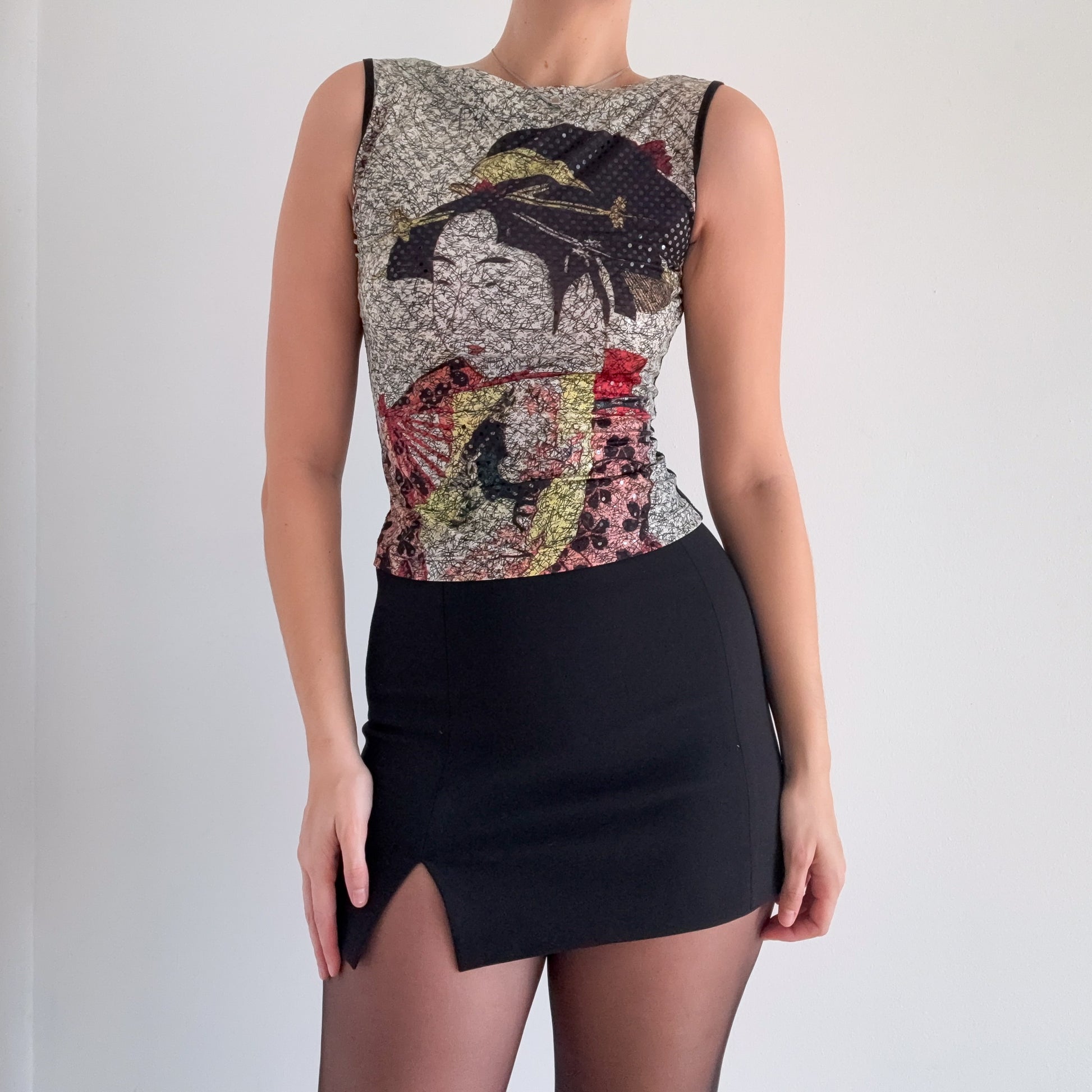 feels like polyester in front--soft fabric in back--printed with sequins in front--Y2K Rampage--boat neck--back has minor pilling