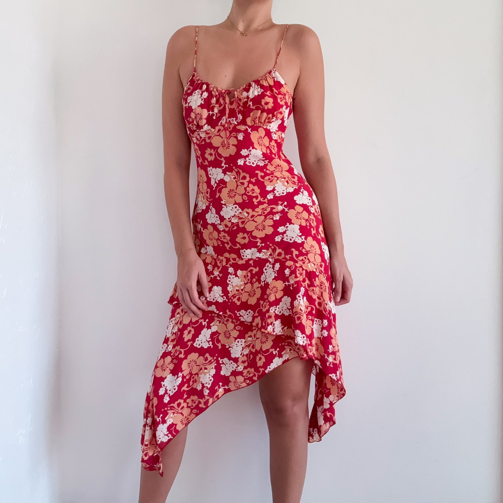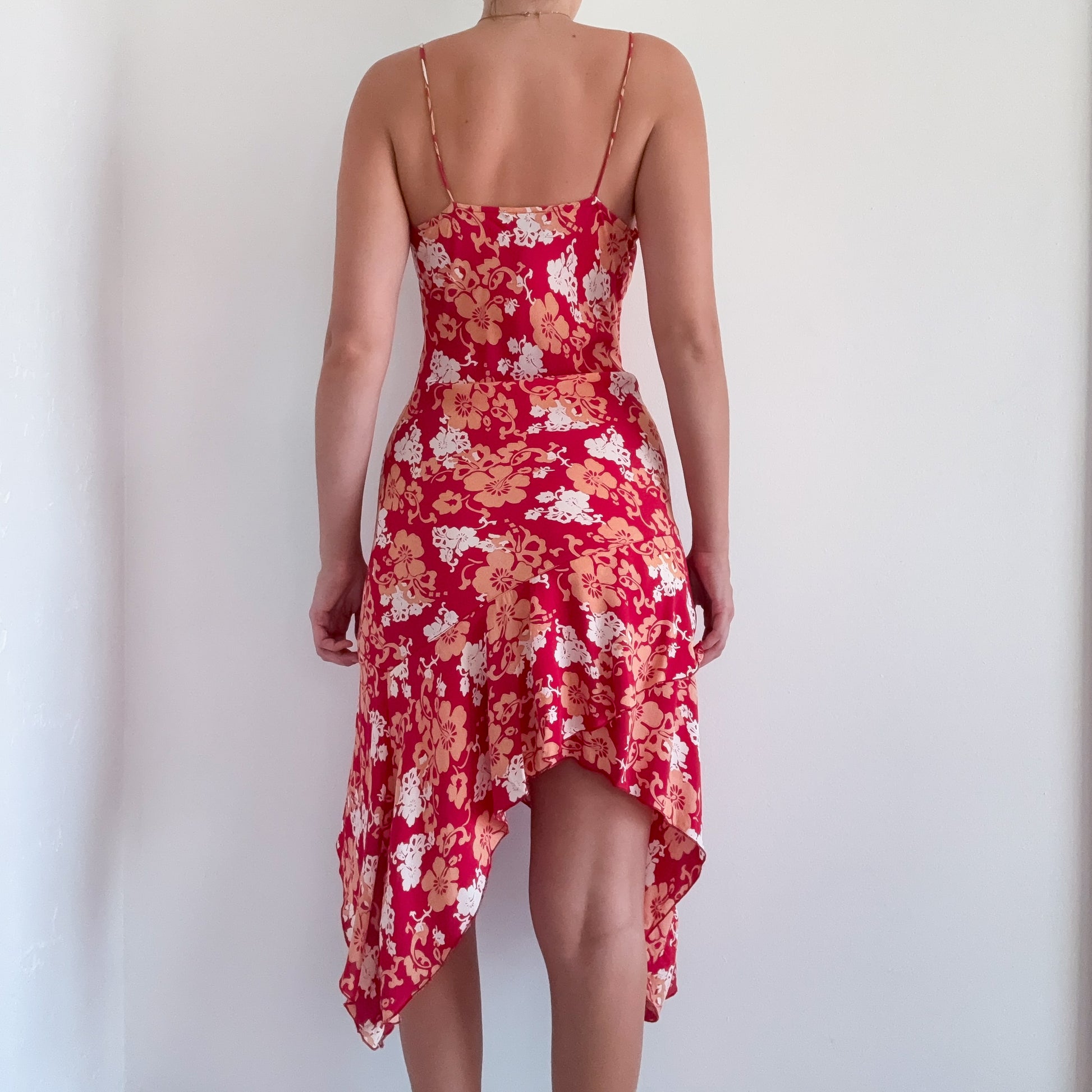 Y2K Red & Orange Rayon Floral Midi Dress / SZ S-M