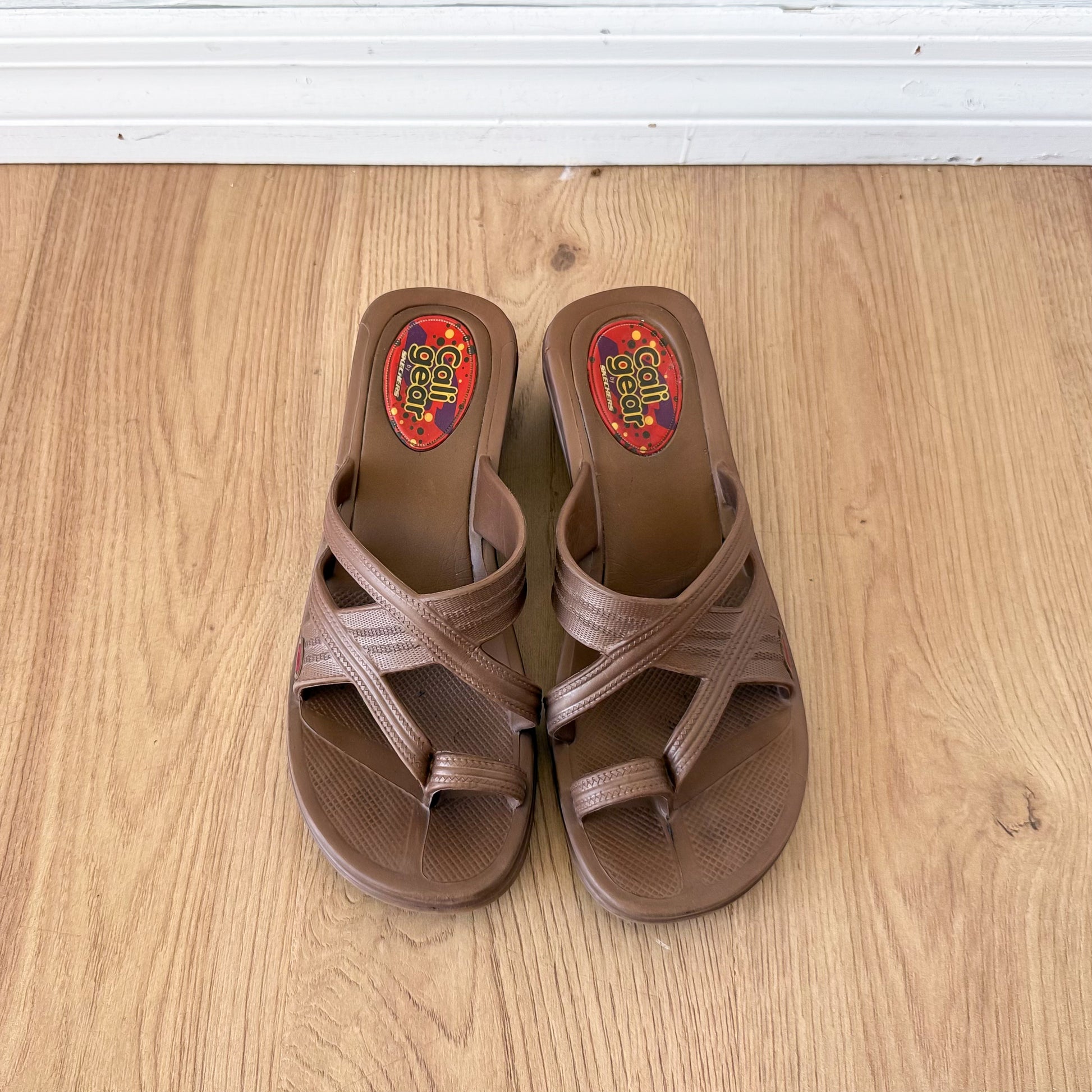 strong foam/rubber material--Y2K "cali gear" by Sketchers--toe ring straps--wedge heel with cutout