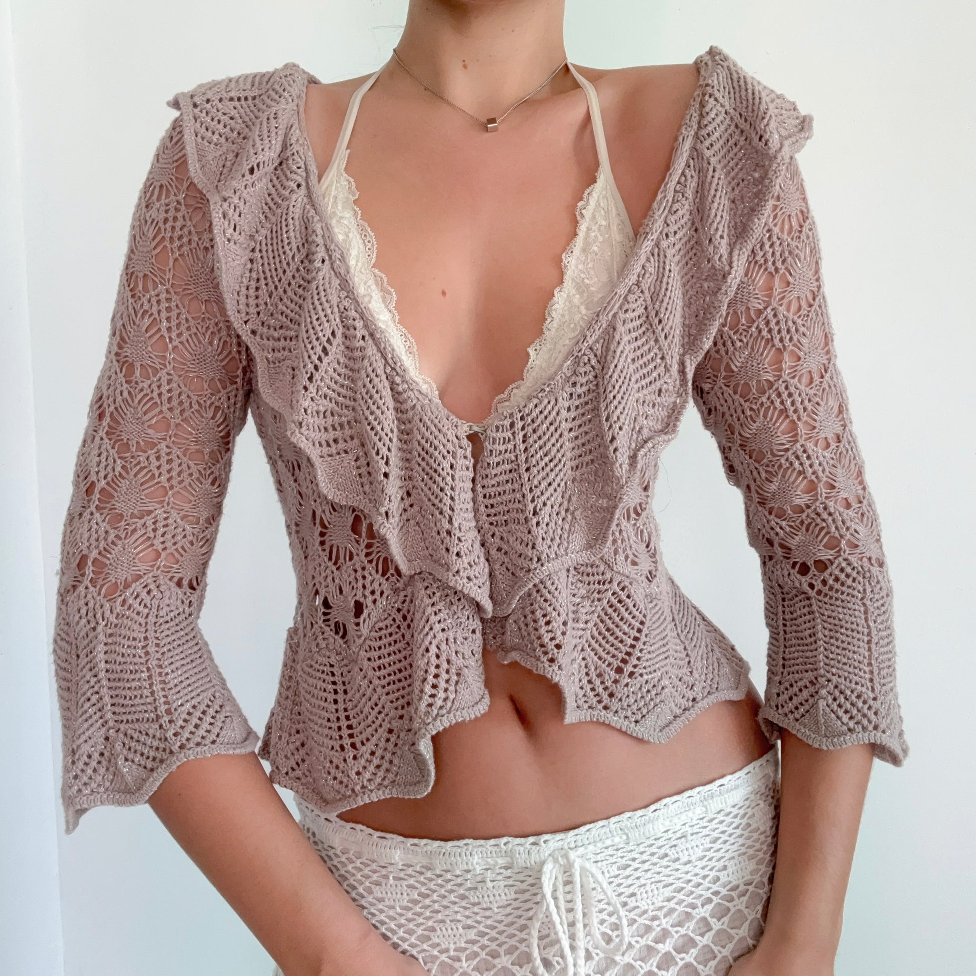 Y2K Taupe Metallic Knit Ruffle Cardigan / SZ XS-S