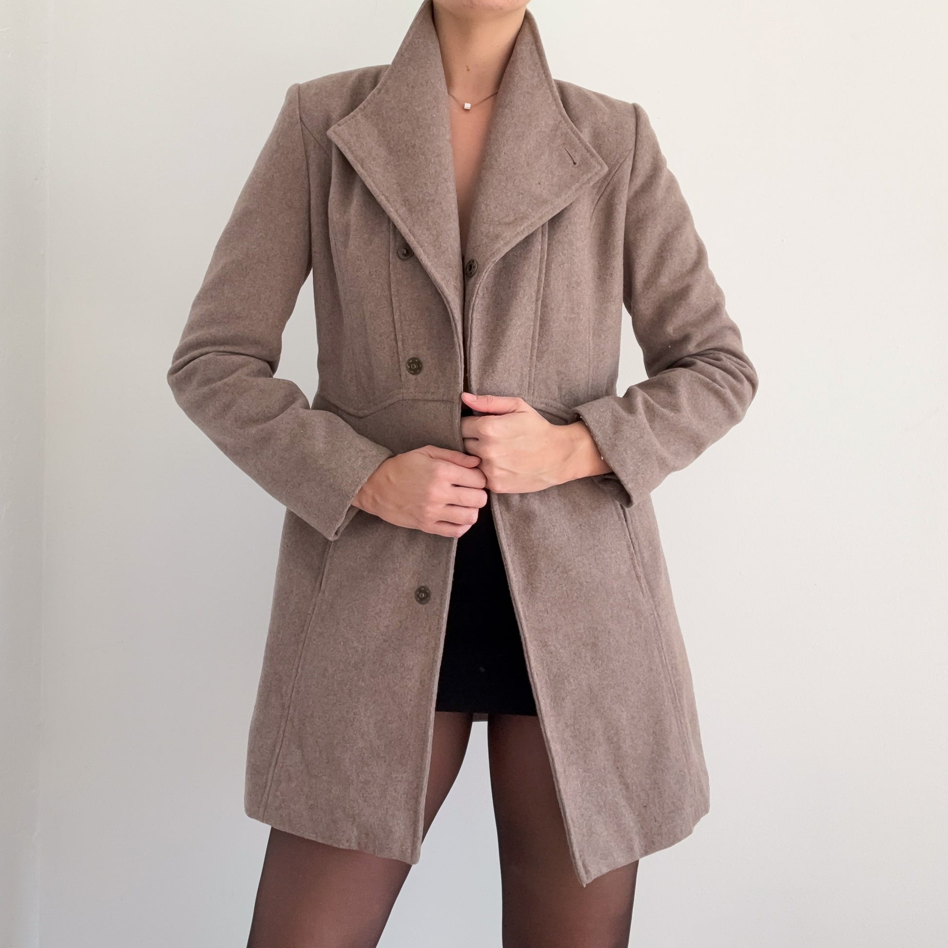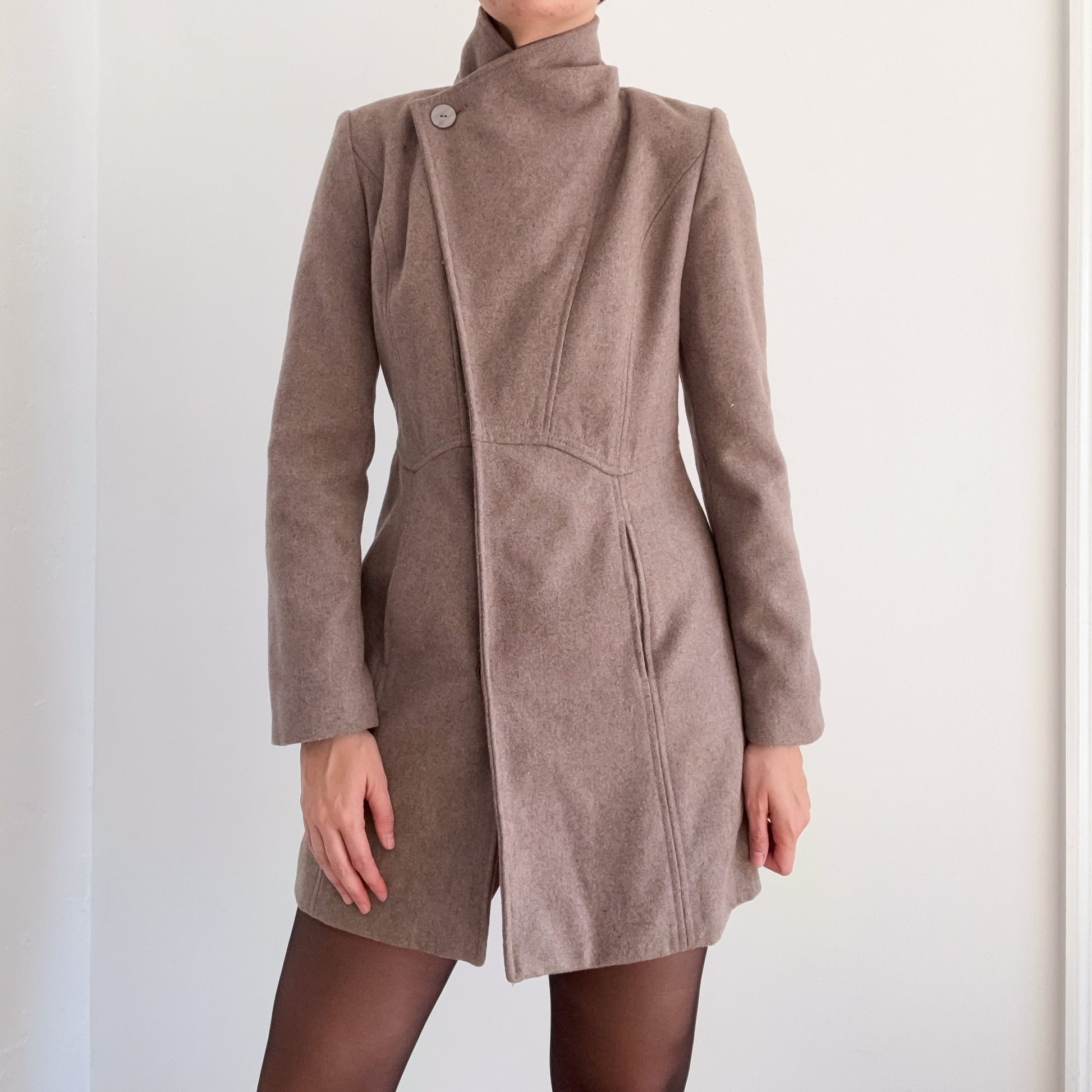 wool poly acrylic blend--lined--Y2K Merona--front snap button closure--side pockets--back slit--high mock neck--flap-over detail --built in shoulder pads--has some minor staining
