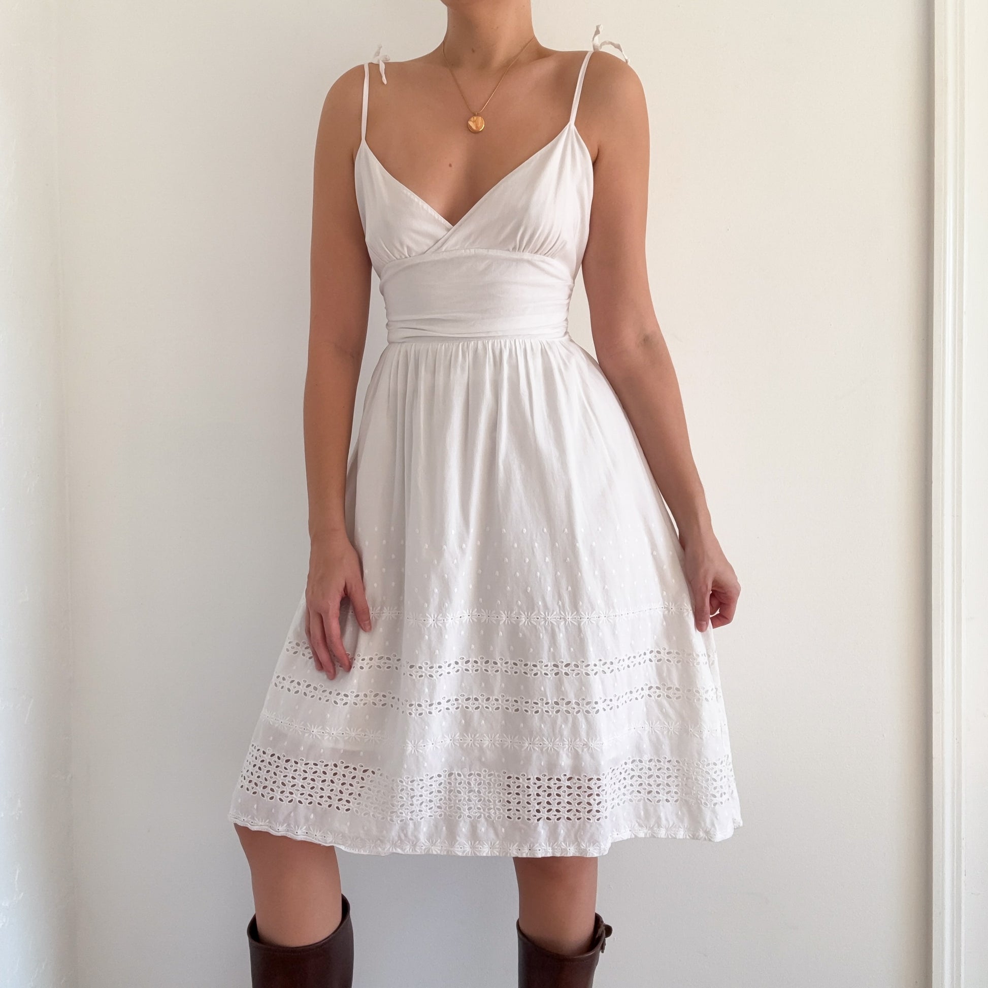 Y2K White Cotton Eyelet Midi Dress / SZ M