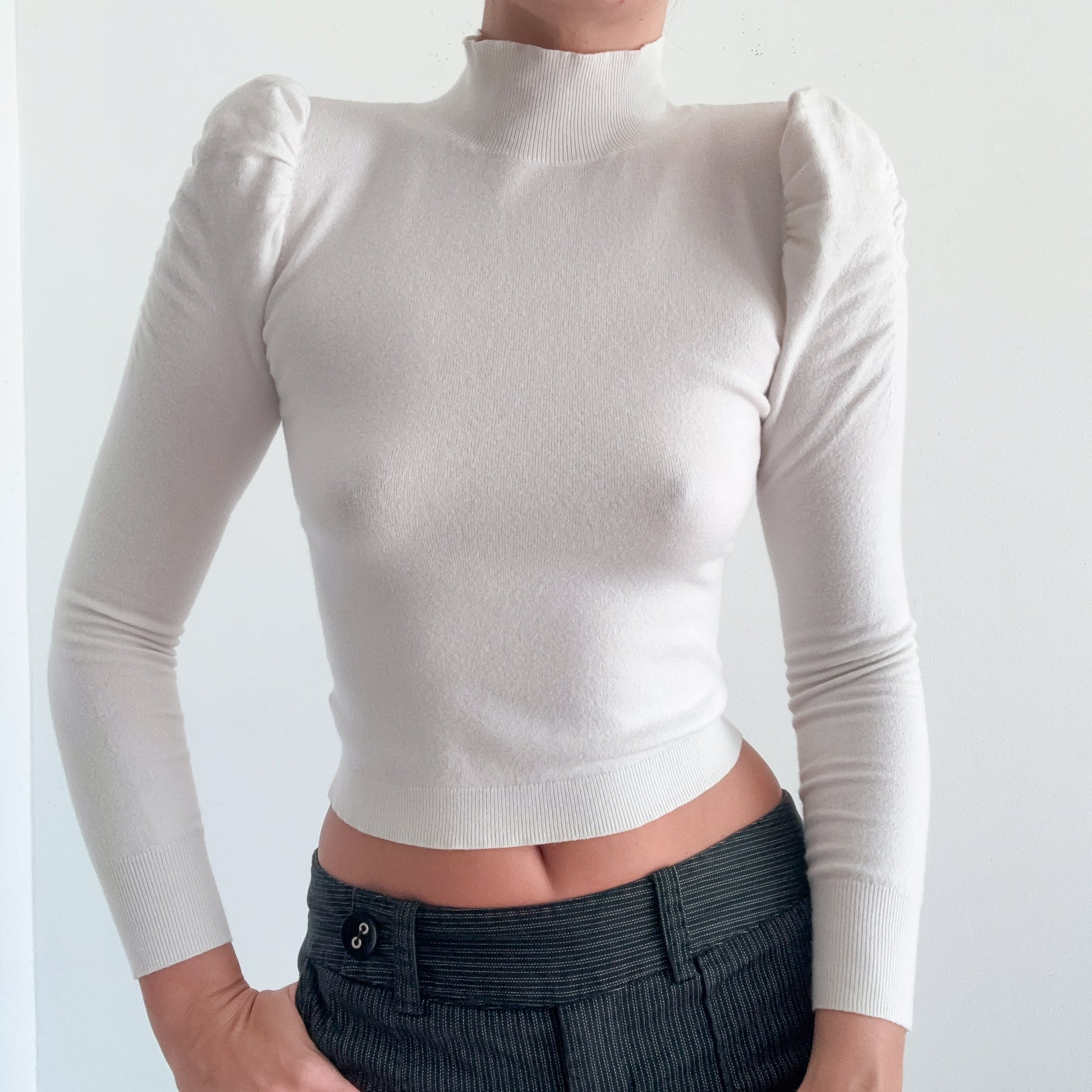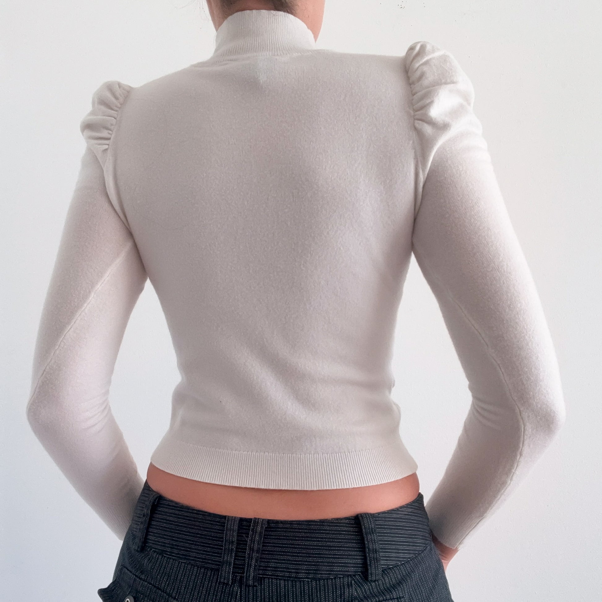 Y2K White Knit Puff Sleeve Mock Neck / SZ S